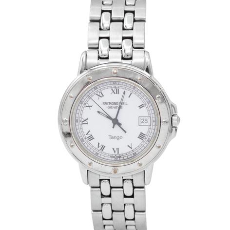 reloj Para caballero “raymonD weIl” *tango* referencIa 5560 caja 35 mm y Pulso acero, carátula blanca, números romanos, mov cuarzo, comPlIcacIones: fecHaDor, serIe z676xxx, calIbre 955.412, joyas 7, eDo cons: satIsfactorIo