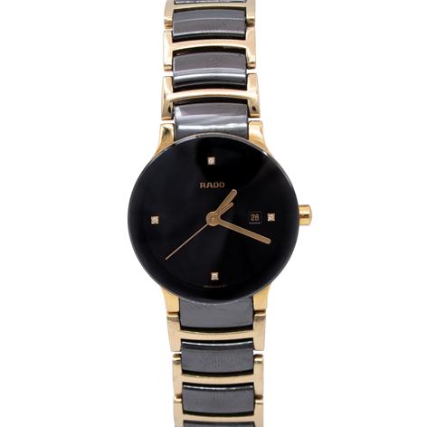 reloj Para Dama “raDo” *centrIx* referencIa 111.0930.3 caja 28 mm y Pulso en cerámIca y acero DoraDo, carátula negra, DIamantes en InDIcaDores, mov cuarzo, comPlIcacIones: fecHaDor, serIe 13881xxx, calIbre 956.112, joyas 7, gramos 60.4, eDo De cons: satIsfactorIo