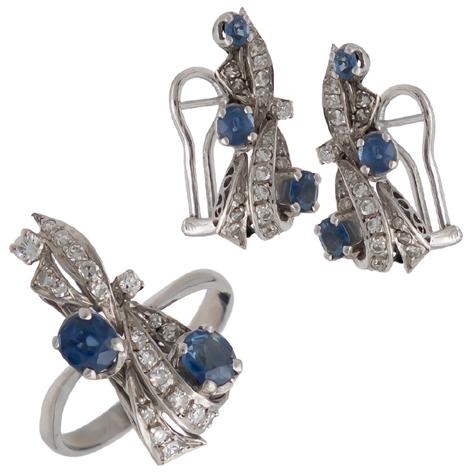 juego De aretes y anIllo confeccIonaDo en oro blanco 14k con zafIros 1.54 ctw (0.14; 0.26;0.22;0.11;0.23;0 .23;.035x2) DIamantes melee 1.04 ctw grs 9.1
