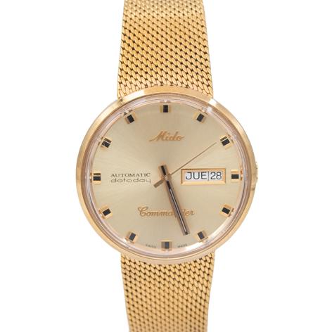 reloj Para caballero “mIDo” *commanDer* referencIa m8429.3.21.13 caja 37 mm y Pulso en acero PvD. DoraDo, carátula DoraDa, sIn cIfras, mov aut, comPlIcacIón: Día y fecHa, serIe 9681xxx, gramos 73.0, eDo De cons: satIsfactorIo $5,300