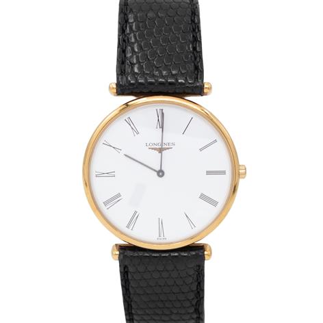 reloj Para caballero “longInes” *la granDe classIque* referencIa l4.720.2.11.2 caja 33 mm en acero DoraDo, Pulso PIel (DIferente, HebIlla orIgInal) carátula blanca, números romanos, mov cuarzo, comPlIcacIones: fecHaDor, serIe 31384xxx, calIbre l.263.2 y 955.412, joyas 7, gramos 26.7, en estucHe, eDo De cons: satIsfactorIo