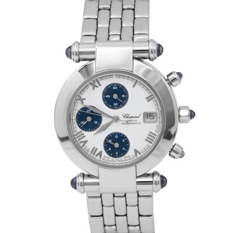 reloj Para Dama” cHoParD” *ImPerIal* referencIa 37/8210-33 caja 37 mm y Pulso en acero con gemas De color azul talla cabujón, carátula blanca, números romanos, movImIento aut, comPlIcacIones: fecHaDor, cronógrafo, serIe 783xxx, calIbre 2892 a2, joyas 21, eDo De cons: satIsfactorIo
