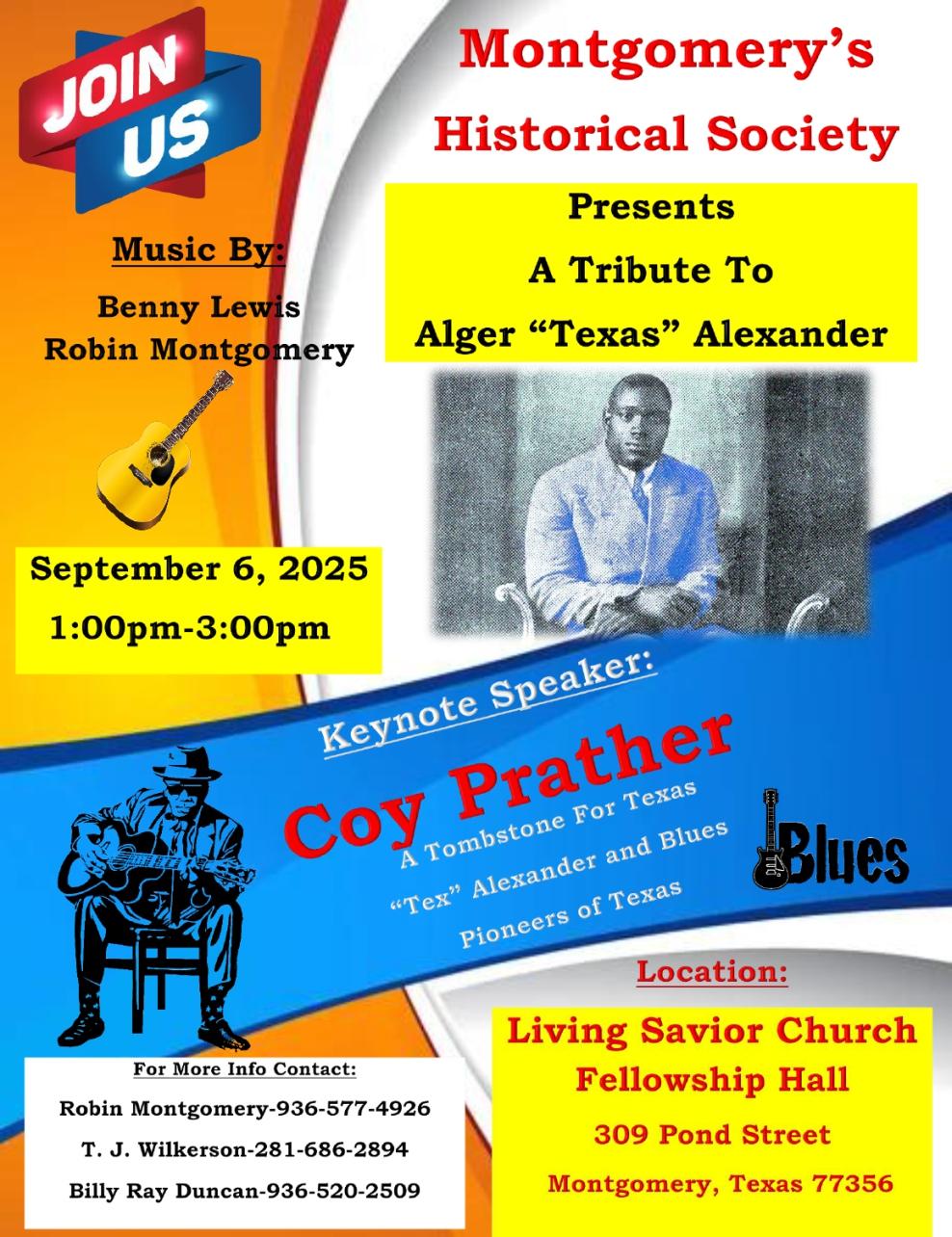 forTexas:TexasAlexander and the Blues Pioneers of Texas.” Prather will give a n o v e r v i e w o f Alexander s life and his influence of Blues music. A special treat will be a song from African AmericanBluessingerand residentofRichards,Lewis Sweeny, who will sing a song in Honor of Mr of Alexander