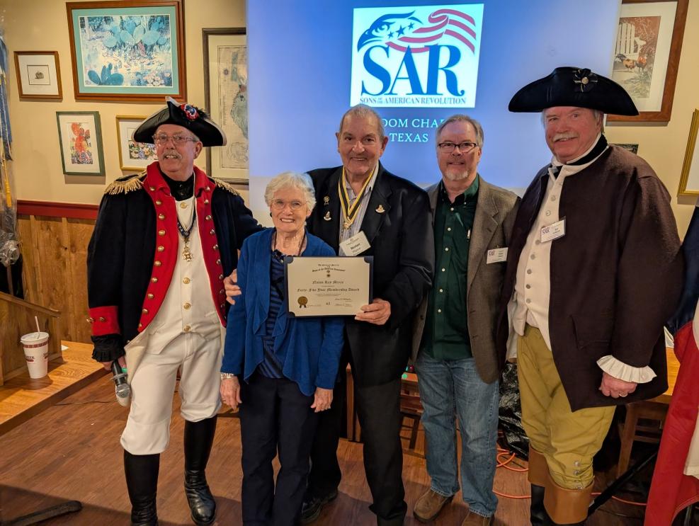 Nolan Ray Maxie received his 45-year service pin and certificate to our great organization. Nolan Ray Maxie along with the help of his wife, Bobbie Jean Maxie, chartered the Sons of the American - Freedom Chapter March 1 1986 The Sons of the American Revolution is a lineage organization to trace our family history back to a