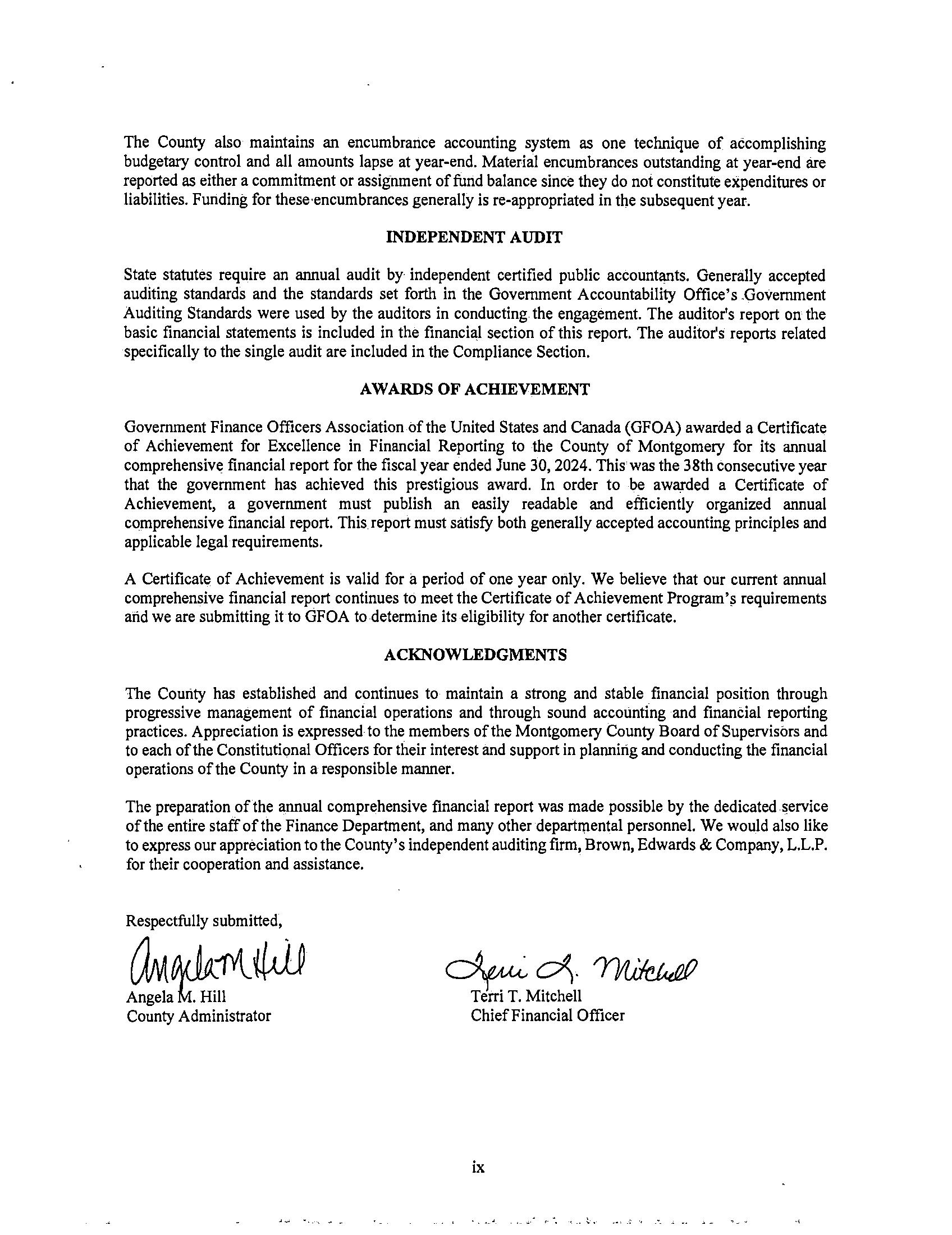 We are pleased to present to you the Annual Comprehensive Financial Report (ACFR) of the County of MontgomeryforthefiscalyearendedJune30,2025,asrequiredbystatelaw.Thefinancialstatementsand supplementalschedulescontainedhereinhavebeenauditedbytheindependentcertifiedpublicaccounting firmofBrown,Edwards&CompanyL.L.P.,andthefirm’sunmodifiedopinionisincludedintheFinancial Section of this report. Responsibility for both the accuracy of the data, and the completeness and fairness of the presentation, including all disclosures, rests with management. To the best of our knowledge and belief,theencloseddataisaccurateinallmaterialrespectsandreportedinamannerthatpresentsfairlythe financial position and results of operations of the various funds and component units of the County. All disclosuresnecessarytoenablethereadertogainanunderstandingoftheCounty’sfinancialactivitieshave beenincluded.
