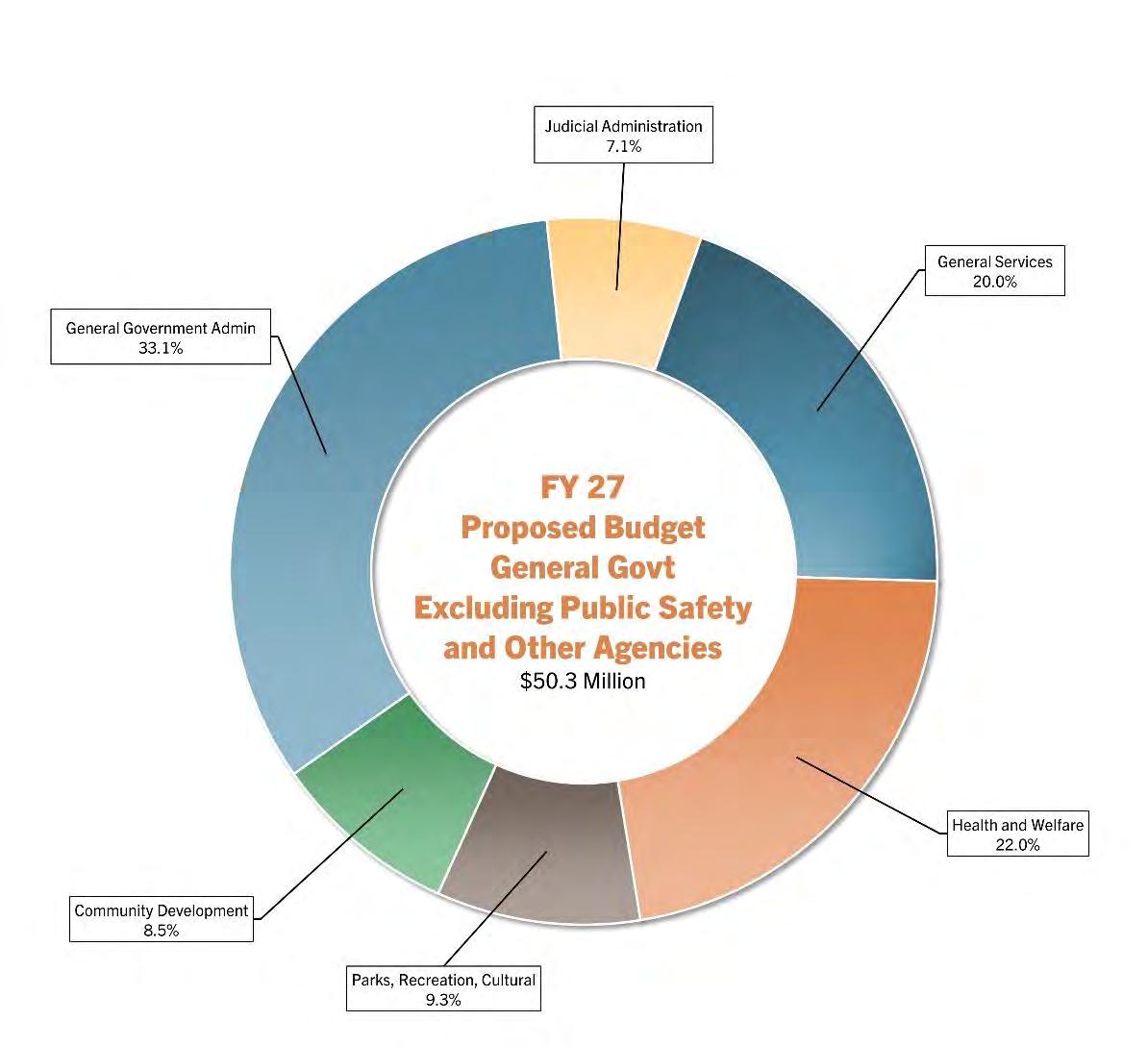 The FY 27 proposed budget includes $50.3 million for general government functions, encompassing general government administration, judicial administration, general services, health and welfare, parks, recreation and cultural programs, and community development.