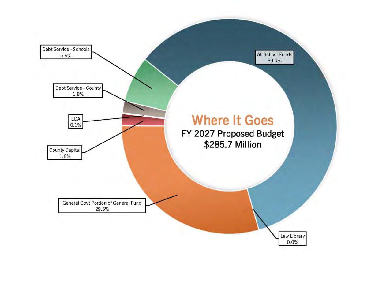 In summary, the proposed FY 27 budget totals $285.7 million, with a real estate tax rate of 81 cents per $100 of assessed value. This budget addresses the needs of a growing community while remaining fiscally responsible, allocating 56 percent of new undesignated revenue to public schools, six percent to public safety, and 38 percent to general County functions.