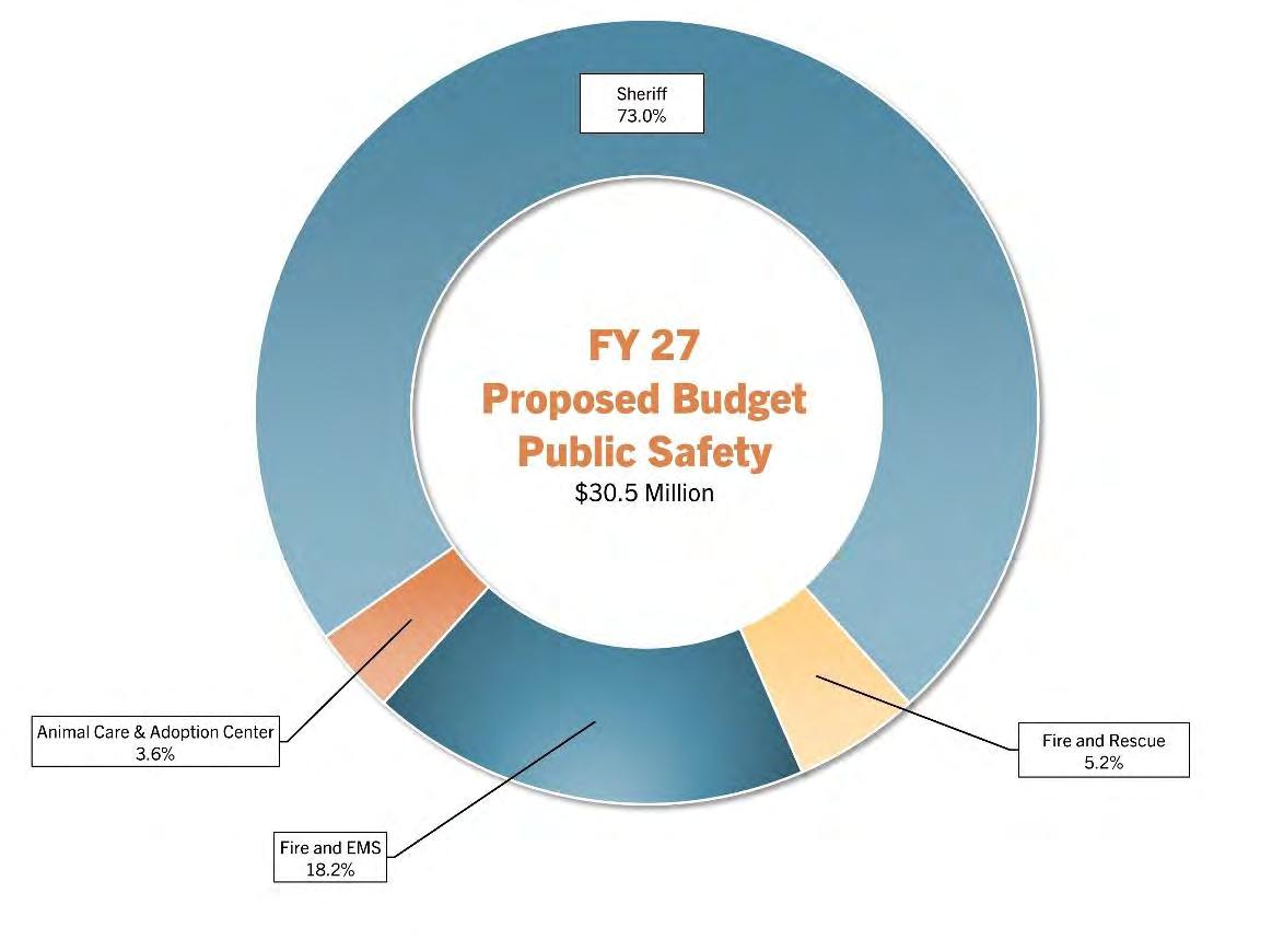 Public safety includes the Sheriff’s Office; Western Virginia Regional Jail Authority; Fire and EMS Department; Volunteer Fire and Rescue Agencies; and the Animal Care and Adoption Center In FY 27, 11 percent of the overall budget is proposed to be allocated to fund public safety needs. In total, I am recommending $30.5 million in funding to address identified public safety needs in FY 27.
