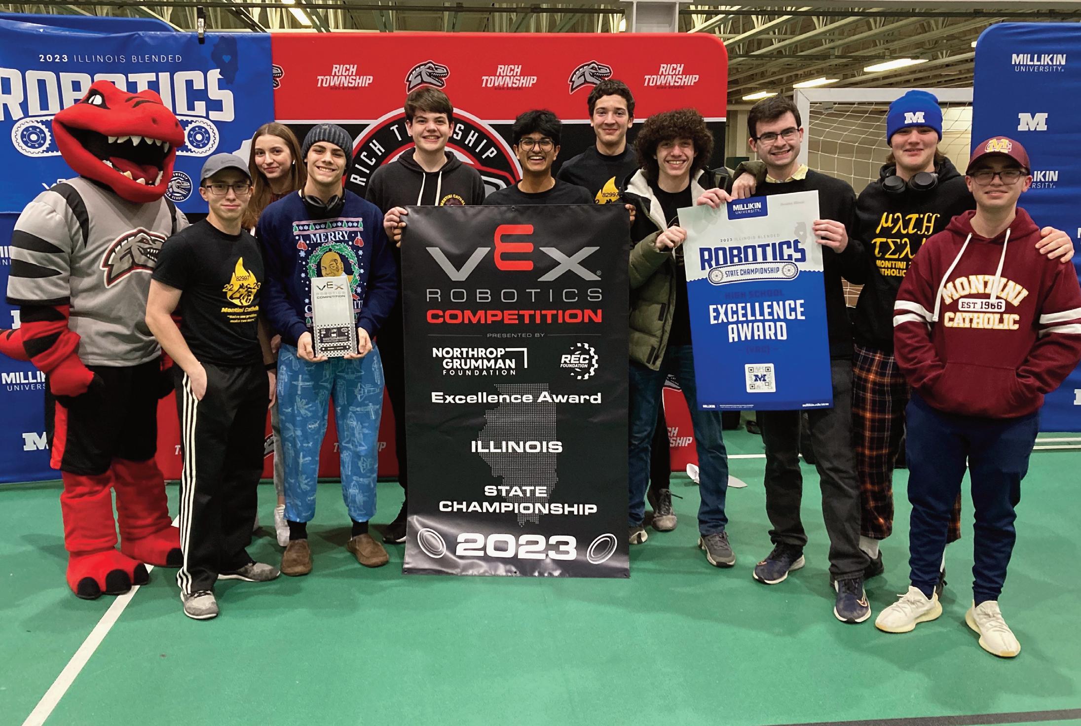 March 11, 2023 will forever be a day of infamy for Montini Catholic's Robotics! That was the day several years of hard work, dedication and teamwork culminated in Montini’s Team 82997A (Team A) earning the top honor at the VEX Illinois State Championship Tournament - the Excellence Award - which VEX describes as "the highest award presented in our Robotics State competition." The prestigious award is presented to the team exemplifying overall excellence in building a high-quality robotics program - Montini!