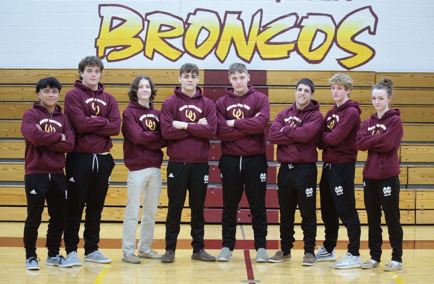 Eight wrestlers qualified for their individual state tournaments - l to r: David Mayora, Mick Ranquist, Ben Dunne, Will Prater, Evan Jocic, Santino Tenuta, Kam Luif and Kat Bell*;