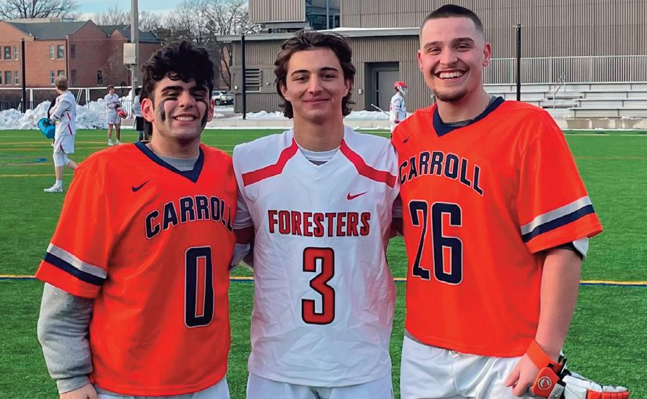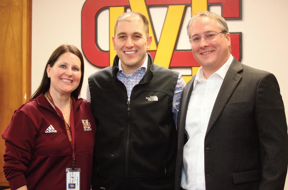 1. Julie (McGivern) Maddox '99 and Tammy Kocher '89 and (with Alumni Director, Katie Hubeny '96) visited us for our second Lunch & Learn session on March 15th. 2. Anthony Petrozza ‘01 and Andy Soderstrom ‘98 joined us on our first Lunch & Learn session on March 1st. 3. Nick ‘20 and Patrick ‘21 Wind returned to support brother Michael ‘23 (middle) on Signing Day; 4. 15 dedicated alumni teach or coach at Montini - we celebrated with a photo in late fall - Chrissy McManus ‘88, William Dawe’s ‘14, Keeley King Dooley ‘ 89, Frank Vosicky ‘ 14, Maggie Signer Vander Leest ‘ 84, Jim Ryan ‘00, Melanie Bava Comella ‘10, Pete Farina ‘87, Katie Doll Hubeny ‘96, Mike Bukovsky ‘83, Michelle Ptak O’Connor ‘88, Andrew Weisenburger ‘05 and Anne Westerkamp ‘84 (not pictured, Jenny Long Kavanagh ‘97 and Brian Casey ‘01); 5. Former teammates Anthony Defilippis ‘22, Mario Florio ‘22 and Brady Raczkowski ‘22 met on the lacrosse field this spring; 6. John McCauley '81 and Mary Cesaretti Traficanti '70 modeled furs from York Furrier at Montini’s Fashion Show in December; 7. Ralph Ortiz ‘20 (with Coach Janor) met up with his Broncos during their spring break trip to Arizona and gave them a tour of Arizona State University;