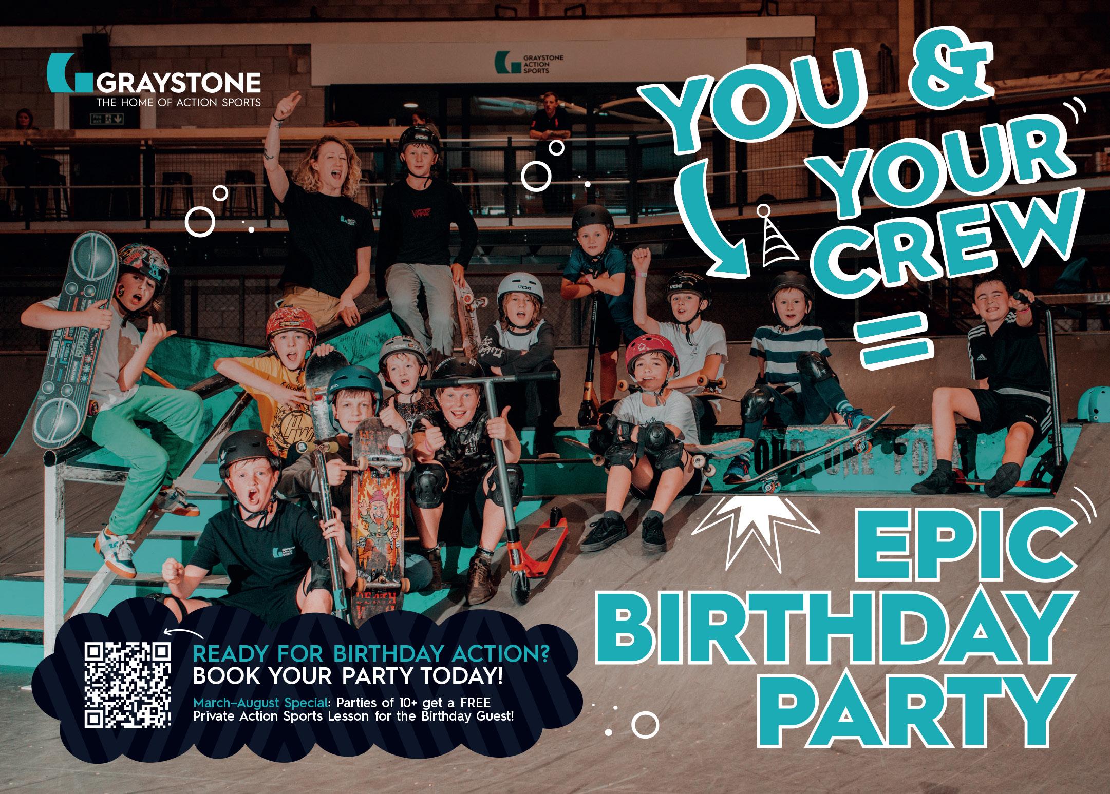 Get ready for the ultimate birthday party at Graystone Action Sports! Their parties focus on great coaching, exciting activities and an experience that kids will genuinely love. Choose from skateboarding, scootering, climbing, parkour or trampolines, all led by dedicated expert coaches just for your group. Parties start from just £20 per person and include 90 minutes of your chosen activities, with coaching, guidance, and fun games throughout. After the action, enjoy 45 minutes in your own party room with amazing food freshly made in the on-site restaurant. Graystone also offer ‘Mini Shredders’ parties for under 7s.