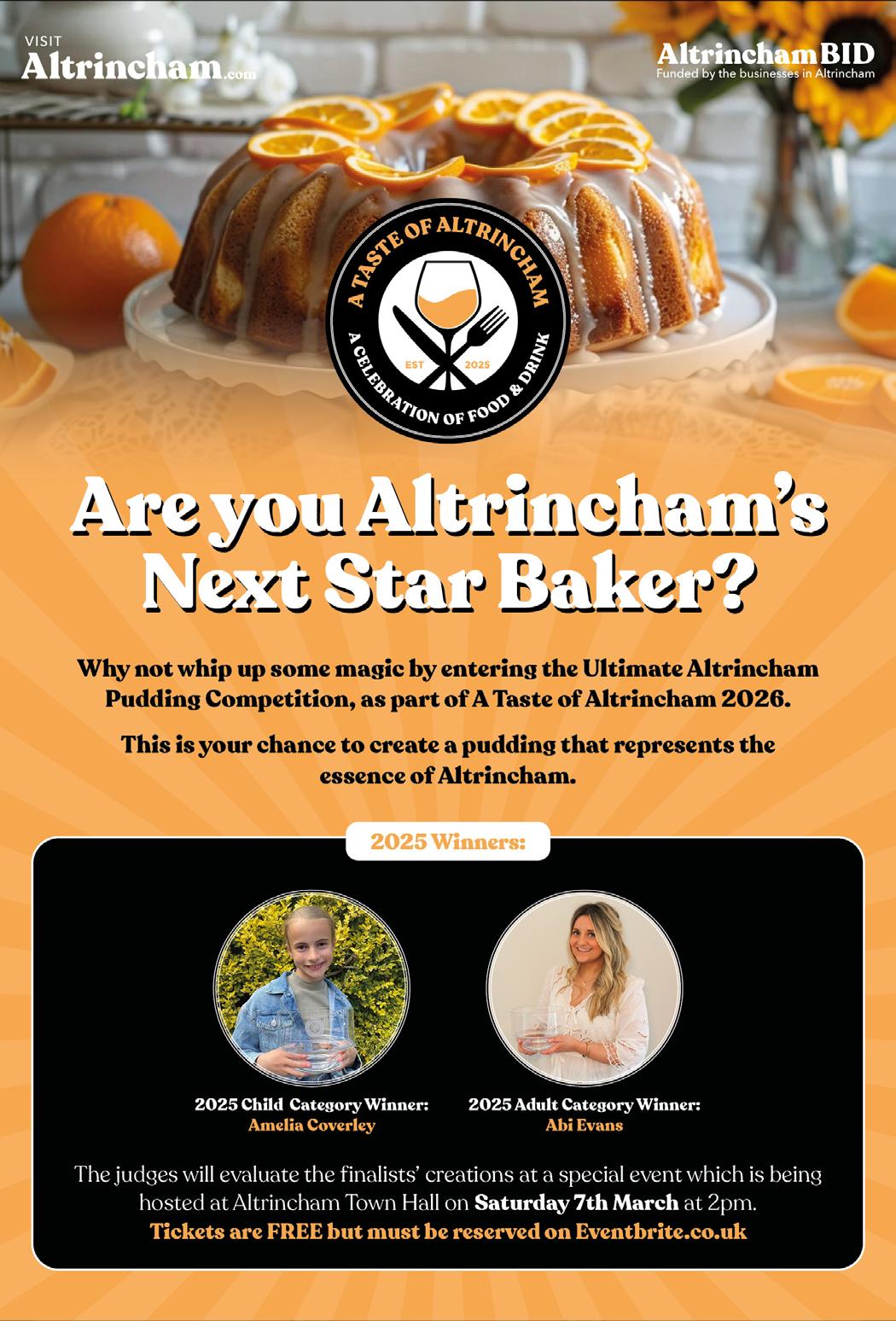 Altrincham BID invites primary schools to take part in the Ultimate Altrincham Pudding Competition 2026, part of A Taste of Altrincham. From Friday 27th February to Saturday 7th March, children aged up to 11 are challenged to design a fun, creative pudding or cake inspired by Altrincham’s history, markets, or community. Finalists will present their creations to judges at Altrincham Town Hall on Saturday 7th March. The winning desserts become the Official Altrincham Pudding 2026. Submit your Altrincham inspired recipe with images of your pudding or cake on email to info@altrinchambid.com