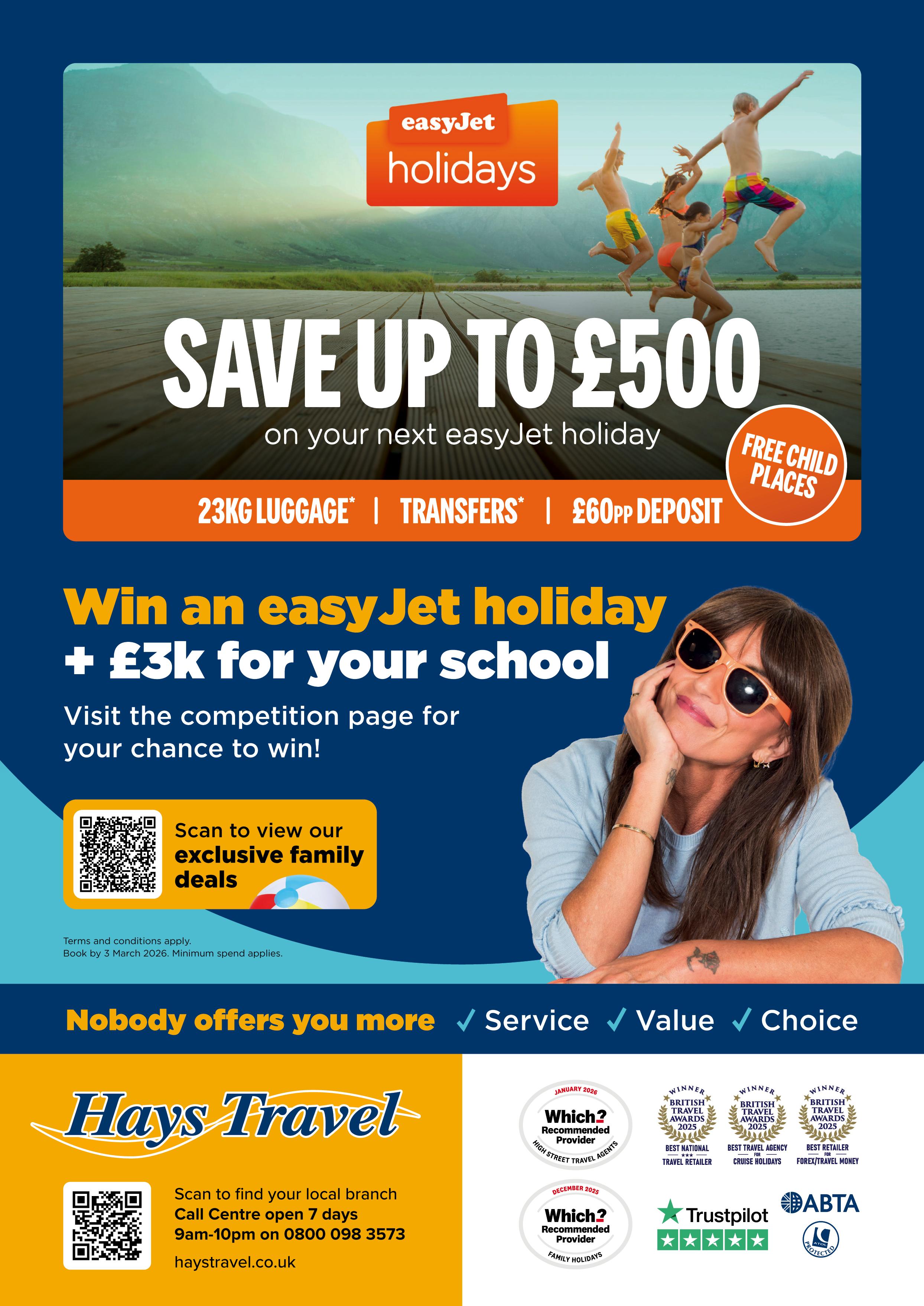 Win big with Hays Travel and easyJet holidays! One lucky family will receive £3,000 towards a holiday of their choice, plus £3,000 for their school. There’s great availability for July and August this year, with flights from your regional airport – the perfect reason to start dreaming! For full terms and conditions visit www.haystravel.co.uk/primary-times