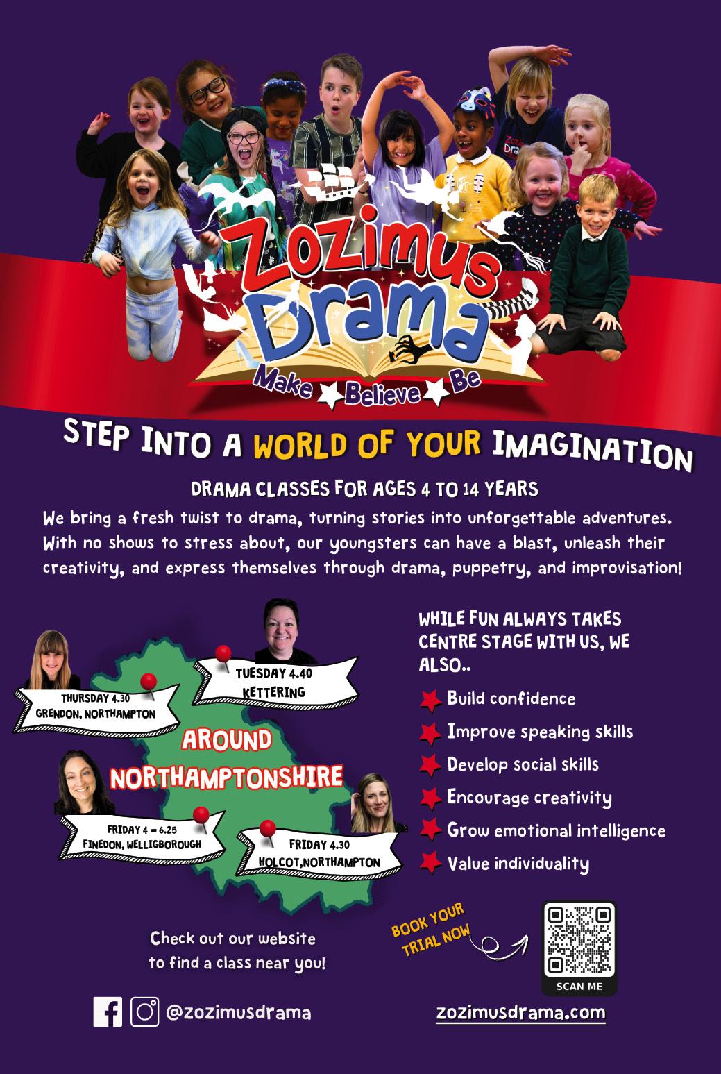 Zozimus Drama runs weekly community classes across Northamptonshire, with sessions on Tuesdays in Kettering, Thursdays in Grendon (Northampton), Fridays in Holcot (Northampton) and Fridays in Finedon (Wellingborough), as well as school clubs and holiday workshops. Check online to find out more.