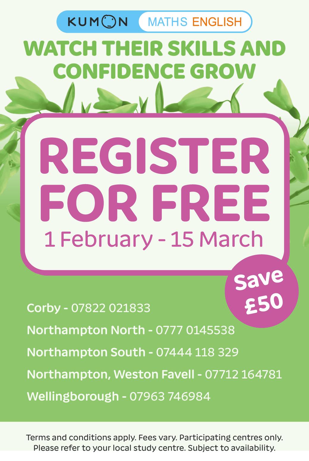 Now is the perfect time for your family to discover the benefits of Kumon at one of the Kumon Study Centres who are now offering Free Registration to new and returning students from 1st February until 15th March. Take this opportunity to save money and help your child stand out from their peers!