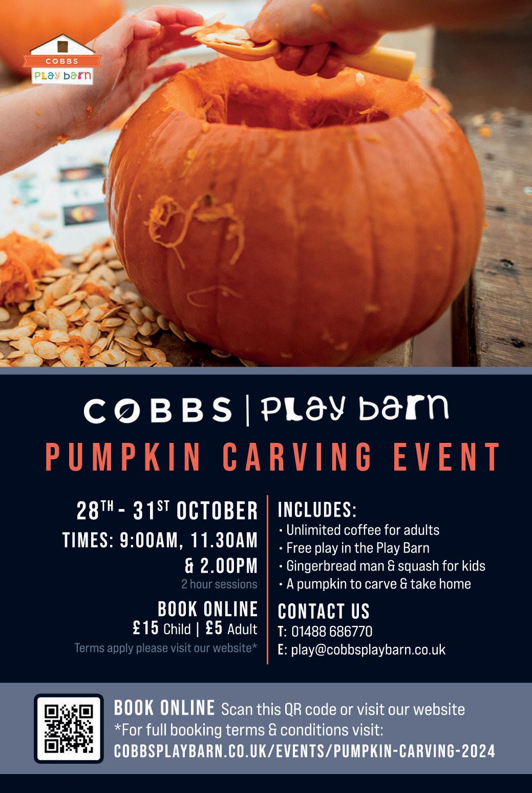 Join Cobbs for a spooktacular pumpkin carving adventure from Monday 28th October to Thursday 31st October. It’s the perfect way to celebrate the season! Please book online.