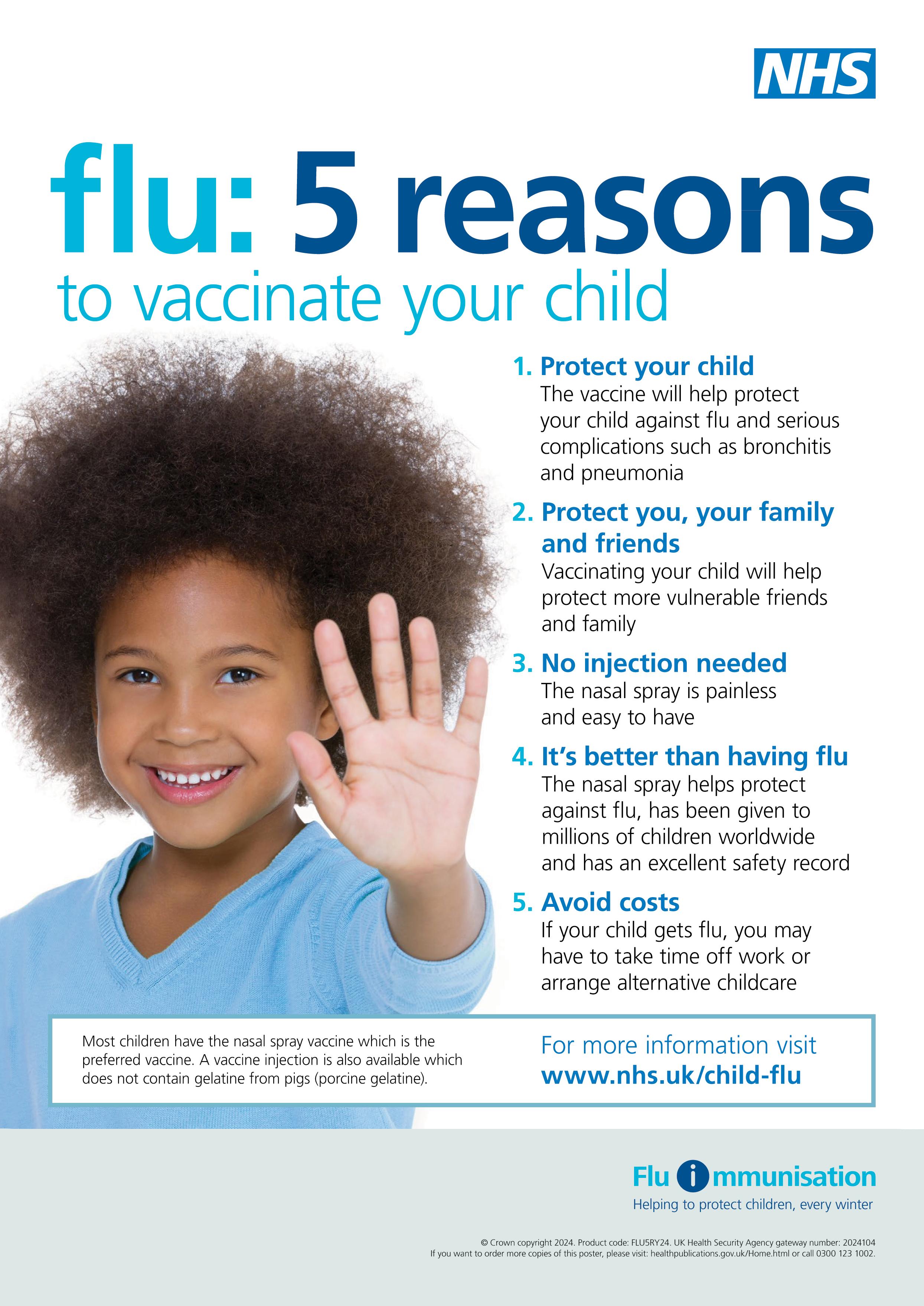 Flu can be a very unpleasant illness and cases increase in December and January. You can still get your child vaccinated. For most children, the vaccine is given as a nasal spray. It is quick, effective and painless. The vaccine has been used for over ten years in schools and GP practices in the UK where millions of children have been vaccinated.