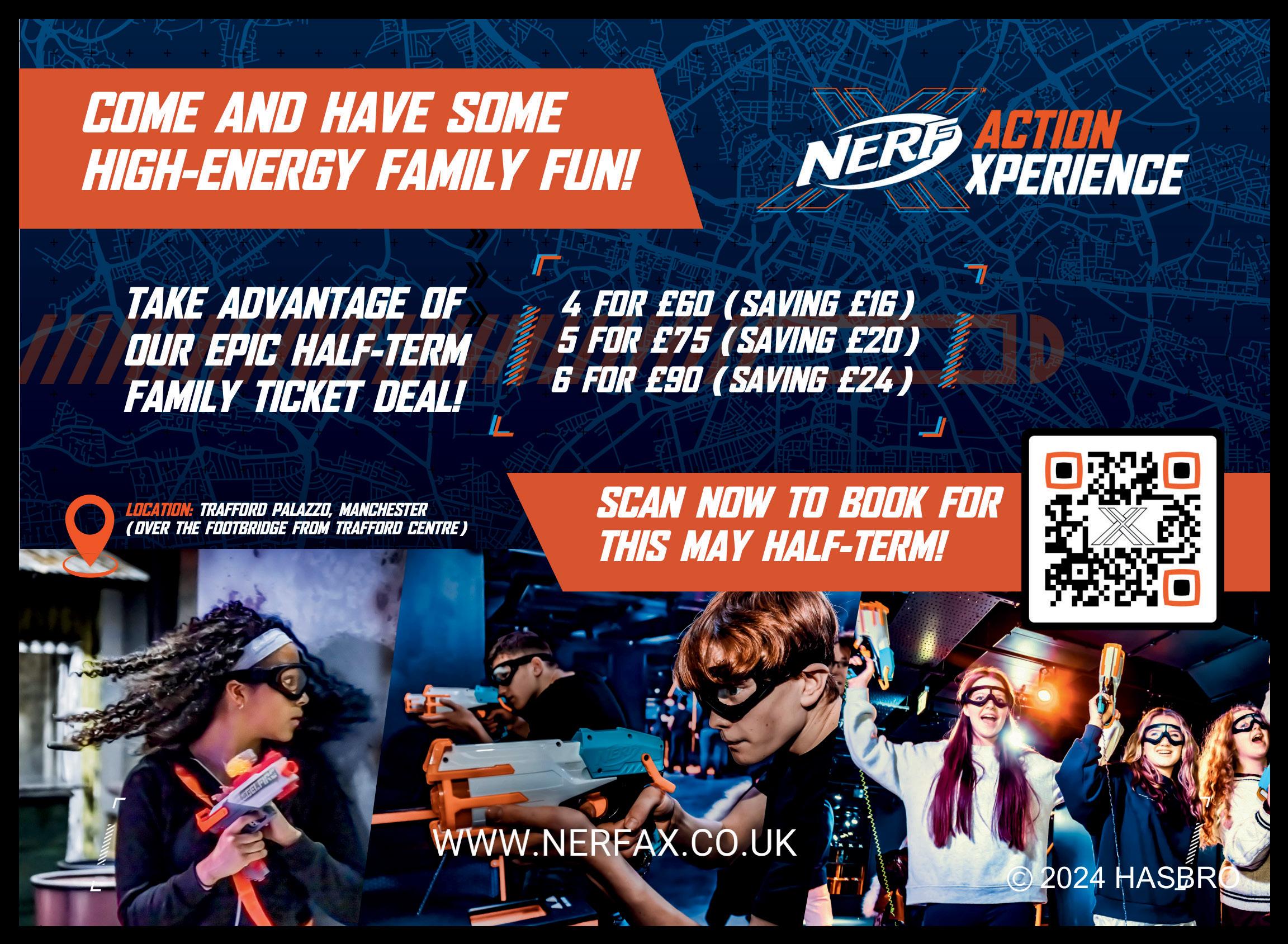 Based at Trafford Palazzo, NERF Action Xperience is the only legit place to play NERF in the UK - with challenges and activities to get the whole family active! You have 60 minutes to navigate five zones for yourself, spending as much time in each zone as you like, including their newly opened PROJECT STEALTH - be the first to test out a high-energy, dodgeball-inspired NERF game! With a huge atrium dedicated solely to NERF Sports, two epic-themed battlegrounds and an arcade-style target range you have all you need for a fun-fuelled, thrilling experience just off the M60 in Trafford! W: www.nerfax.co.uk