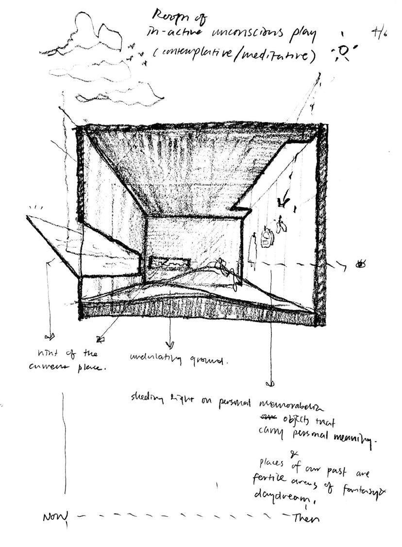 Windows are slightly angled to suggest views directing up, to the endless sky scattered with ephemeral clouds and shaeows. Although one might criticize that the idea of daydreaming and views of moving clouds may seem a one-dimensional architectural translation, it is indeniably peaceful and awe-inspiring; an appropriate setting for unconscious play, daydreaming, and reverie.