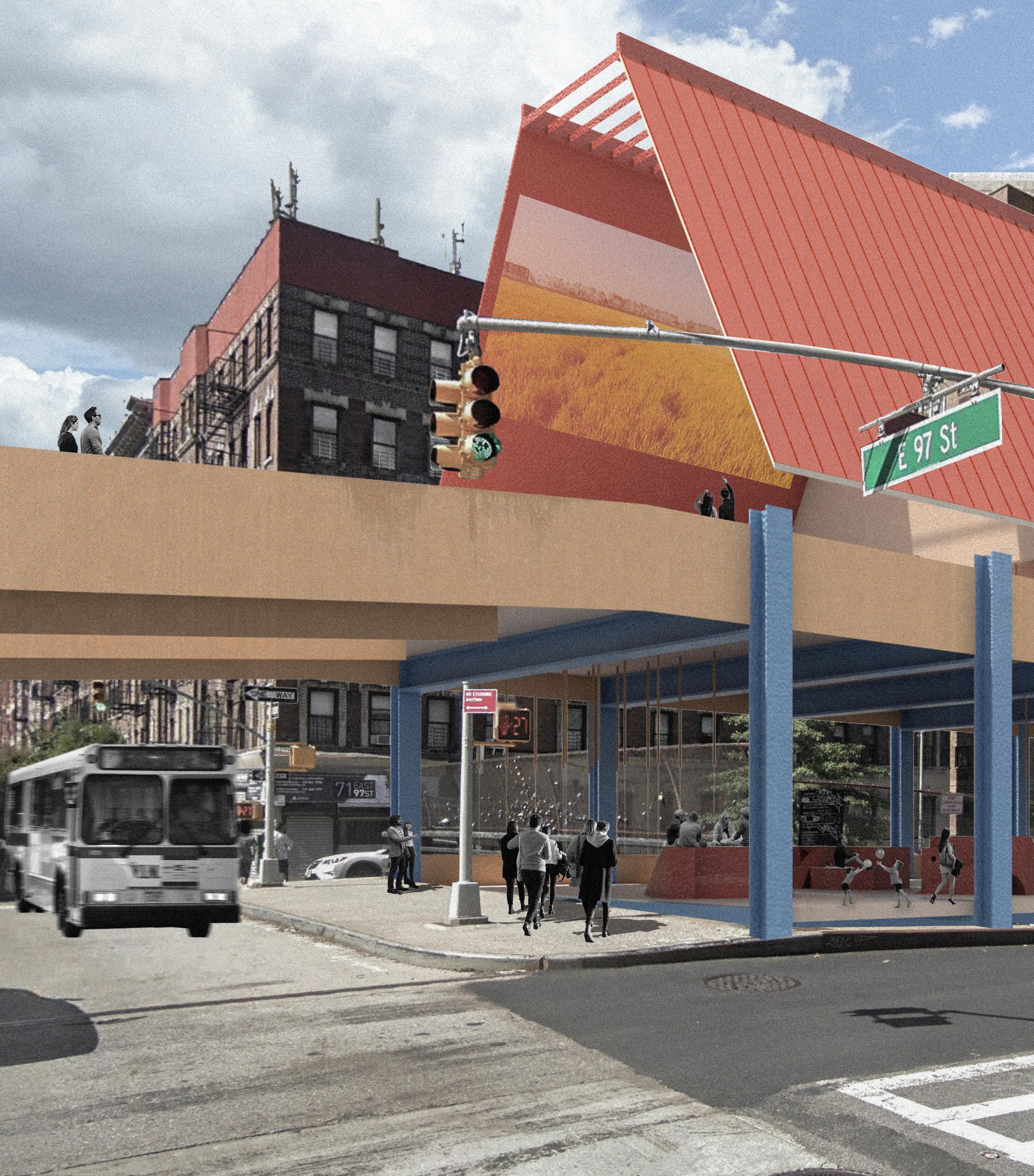 A gathering space is erected at the end of Park ave in New York Cit and above where Park Ave mainline ascends from underground, taking advantage of the used space above the railroad. As a place that cherishes the moments of pause and of unobjective activities, The adult playground space is a place for unconscious play, of daydreaming and reverie. Unconscious play through active and social activities occur close to the ground, whereas meditative private spaces for unconscious play and daydream in the mind form a vertical tower that erects itself in the middle of the active play space. The projects consists of a cafe that transitions to a bar by night, and a private space for a moment of pause, reflection, and dreaming that could transition to a secluded space for