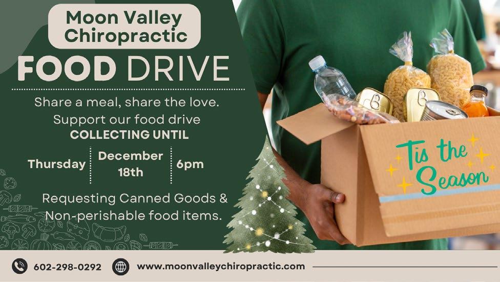 To donate to the community food drive, simply bring your extra canned goods and non-perishables now through Thursday, December 18th, to our lobby drop box during regular office hours or find us online at www. moonvalleychiropractic.com to learn more.