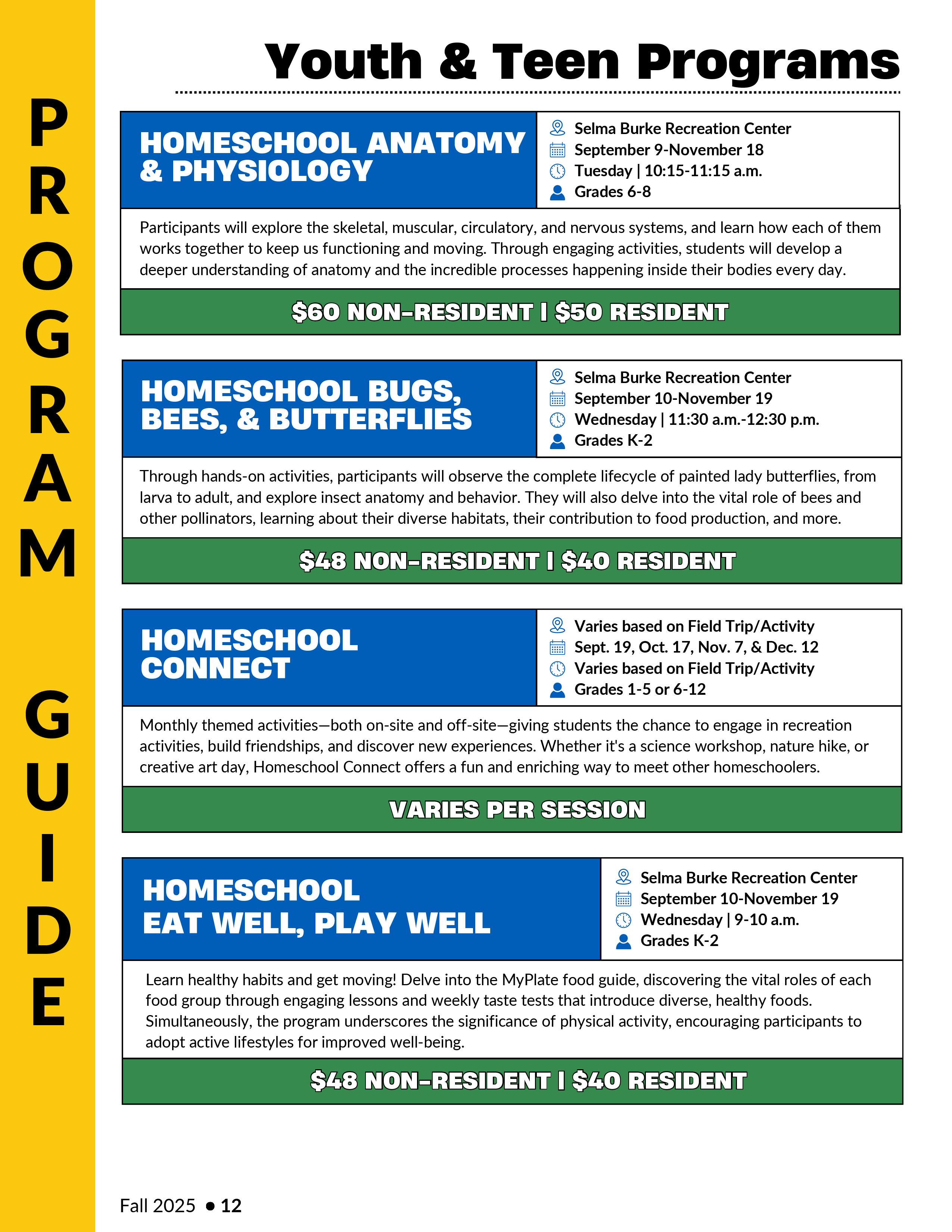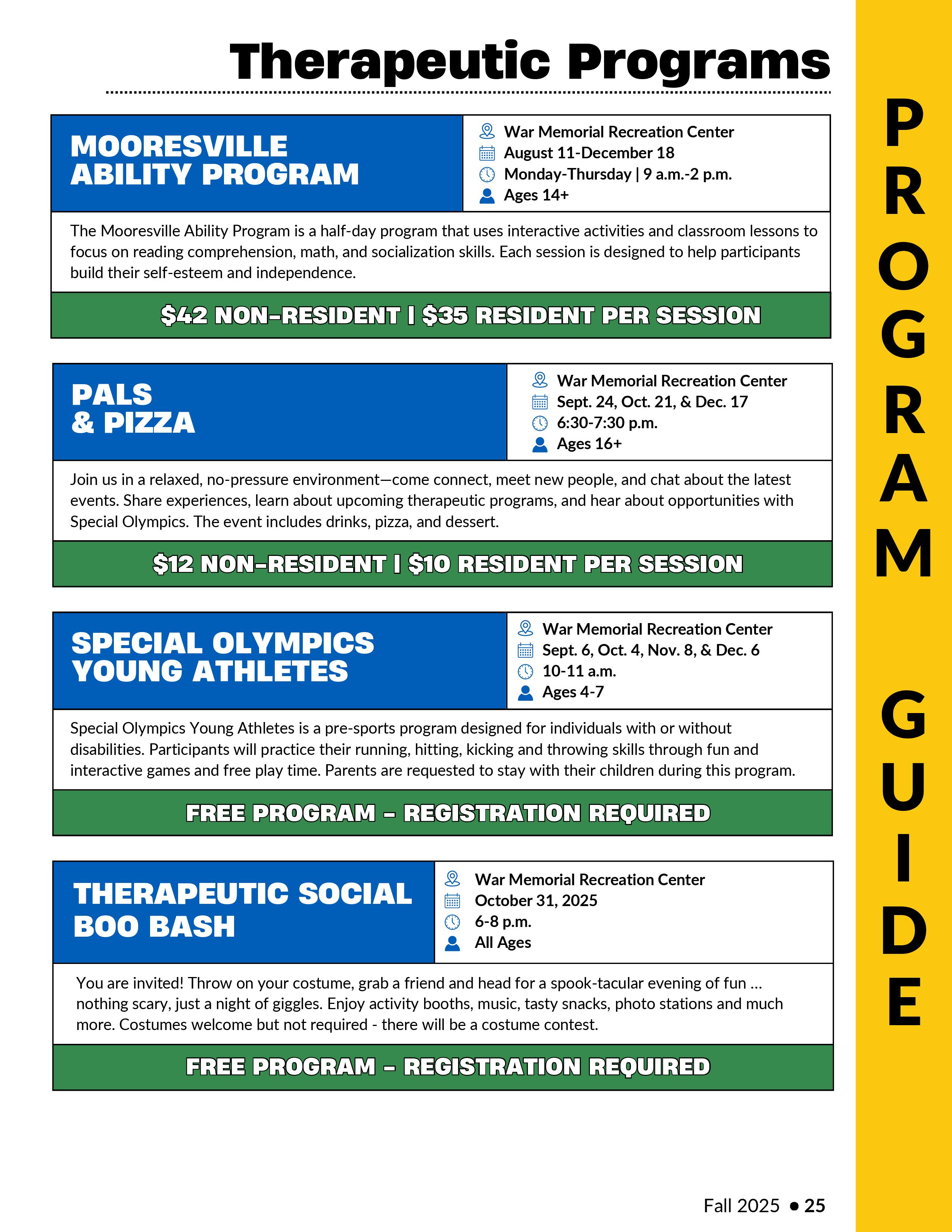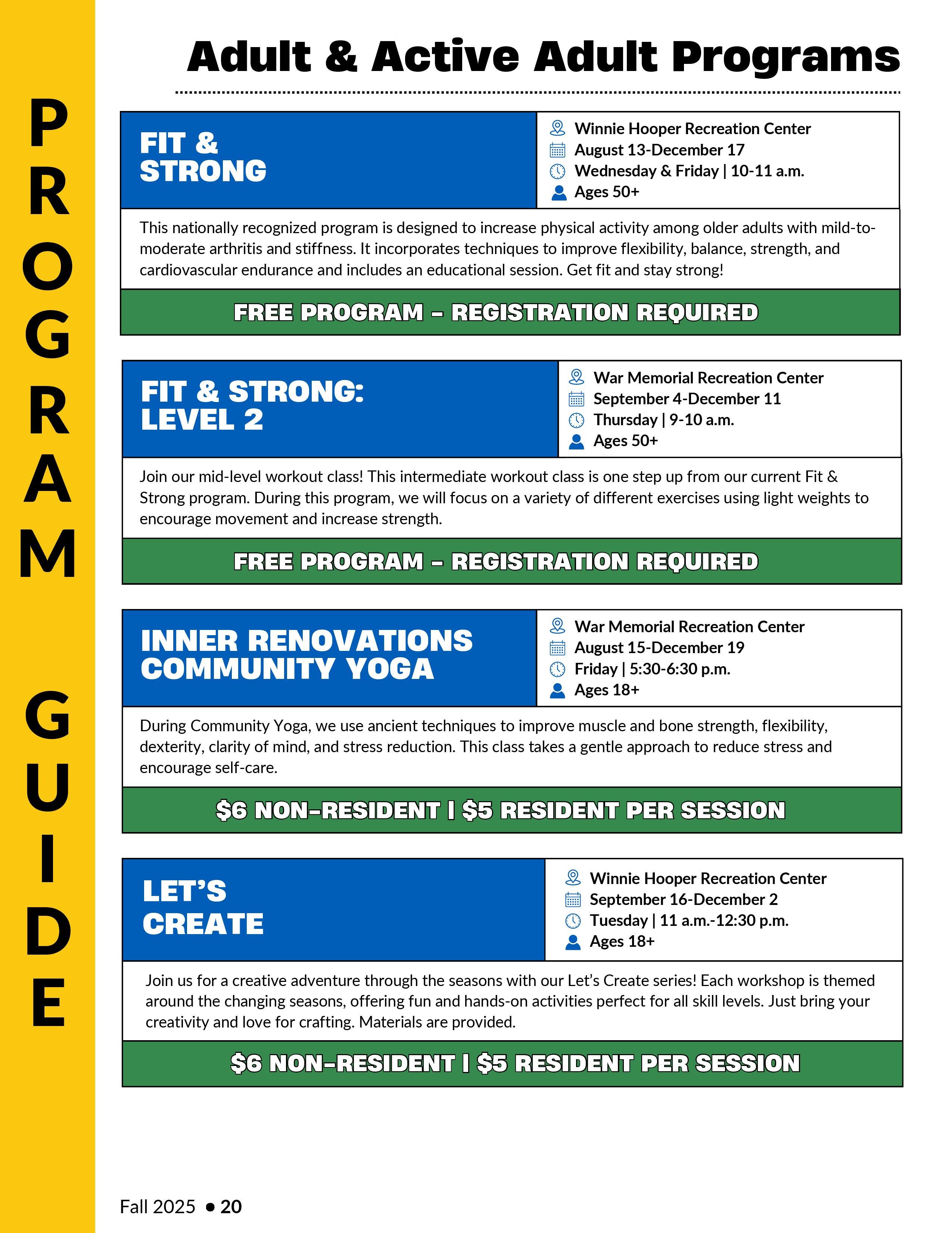 Welcome to your Fall 2025 guide to all things fun, active, and community-centered! This season’s catalog is packed with exciting opportunities for residents of all ages to get outside, stay active, and connect with the community.
