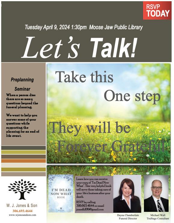 MOOSE JAW’S MOST TRUSTED LOCAL MEDIA Volume 17, Issue 12 | Wed., March 20, 2024 306.694.1322 SINCE 2008 “WELCOME TO THE REAL NEWS” SPEECH! Ltd HEATING • PLUMBING COOLING • BOILERS SALES • SERVICE • INSTALLATION Time to service your furnace and get ready for air conditioning season! 306.694.4747 • 324 Main St N Insurance Motor Licensing Real Estate Canada Post O ce Notary Public Apartment Rentals We have you covered in one convenient location! SERVING MOOSE JAW FOR OVER 113 YEARS! Award-winning musical talent Jack Semple to commemorate Gordon Lightfoot this spring Aaron Walker - Moose Jaw Express / MooseJawToday.com A-1 Tree Service SPRING IS NEAR! Have your Elms & Fruit Trees properly trimmed Stump Removal and Experienced Arborist FREE ESTIMATES Call 306-692-6701 MOOSE JAW’S #1 TREE SERVICE • Prime Rib • Seafood • Steaks • The Original Wings • Unique Atmosphere • Explore The History • Patio Seating (weather permitting) Dining Parlour Est. 1979 65 Athabasca Street West “For an Exceptional Dining Experience” GROUP BOOKINGS DAILY SPECIALS OPEN 7 DAYS A WEEK Hours 11:30am - Close Reservations Recommended (306) 692-5995 www.hopkinsdining.com NEIL ROY Metis History Writer invites the public for a discussion on Wakamow Valley, No charge admission! Moose Jaw Library Theater, March 21 6:00 pm - 8:00 pm