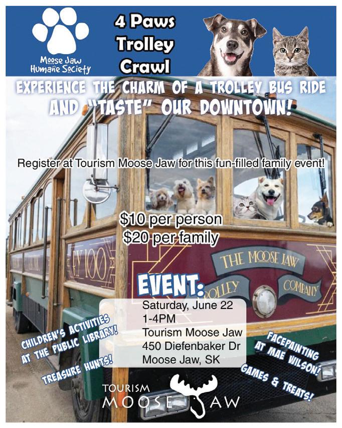 Ltd HEATING • PLUMBING COOLING • BOILERS SALES • SERVICE • INSTALLATION Time to service your furnace and get ready for air conditioning season! The Man’s Best Friend Comedy Tour to raise money for charitable animal organizations Fox Klein - Moose Jaw Express A-1 Tree Service FREE ESTIMATES Tree Trimming & Removal, Tree Spraying, Stump Removal EXPERIENCED ARBORIST Call 306-692-6701 MOOSE JAW’S #1 TREE SERVICE Dining Parlour Est. 1979 65 Athabasca Street West “For an Exceptional Dining Experience” Congratulations G rads 2024 F all Grads and their party receive 10% OFF and Graduates receive a ee dessert with our compliments! OPEN 7 DAYS A WEEK Hours 11:30am - Close Reservations Call (306) 692-5995 www.hopkinsdining.com GROUP BOOKINGS DAILY SPECIALS MOOSE JAW’S MOST TRUSTED LOCAL MEDIA Volume 17, Issue 24 | Wed., June 12, 2024 306.694.1322 “PROUDLY INDEPENDENT” “Locally Owned & Operated” Since 2008 $950 only 2024 1924 at DAILY SPECIALS MONDAY Mushroom Monday TUESDAY Tacos WEDNESDAY Wings THURSDAY Ribs FRIDAY Nachos