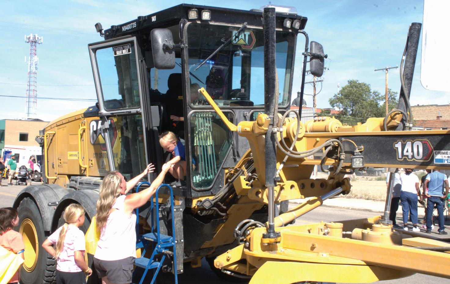 A young guest — and perhaps a future equipment operator — is assisted out of a city grader during the third annual Touch a Truck event on Sept. 7. Photo by: Aaron Walker