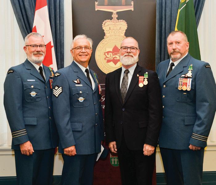 From left, Lt.-Col. Kevin Tipper, commander of 15 Wing Operations Support Squadron, Sgt. Davor Valentic, 15 Wing Air Reserve chief clerk, Master Warrant Officer (Ret’d) Barry Ripley, and Maj. Marvin Macauley, flight standards officer at 2 Canadian Forces Flying Training School, pose after three of them received the Saskatchewan Protective Services Medal from the lieutenant governor. Photo submitted