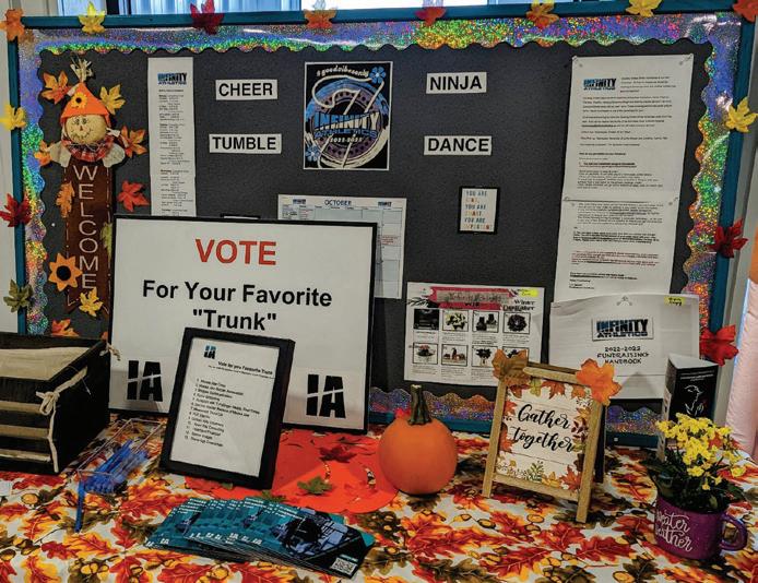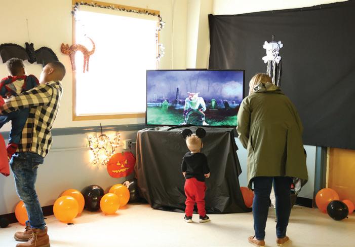 ghosts were displayed. A costume contest was held and Baby shark won the cutest costume award. There was a fun bouncy castle, popcorn to enjoy, interactive an imated videos of dancing zombies, and much more. Although a pumpkin-carving contest was scheduled, no one remem bered to bring a pumpkin to carve.