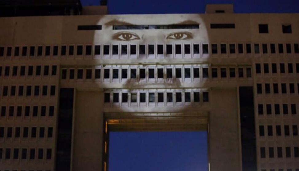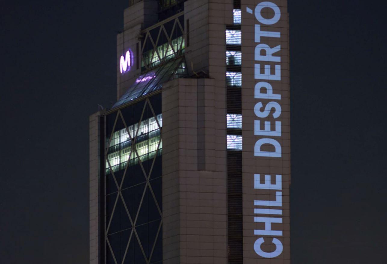 Elestudio de arte y diseño audiovisual Delight Lab pro yectó, en la fachada de Telefó nica, diversos mensajes como forma de activismo: “digni dad”, “chile despertó” y “por un nuevo país”... Esto se da bajo el contexto de 2019 en Chile: crisis social, Estado de Emer gencia, muertes por acción de carabineros.