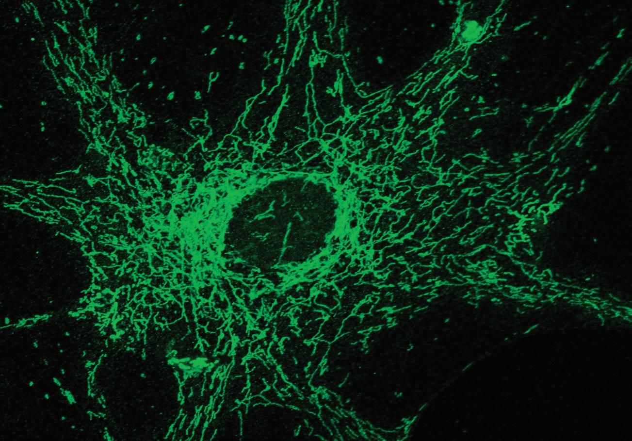 • • • Imaging, below, from the lab of David Krizaj, PhD, at right, depicts mitochondria in trabecular meshwork cells. These organelles power cellular energy metabolism and are sensitive to changes in intraocular pressure.