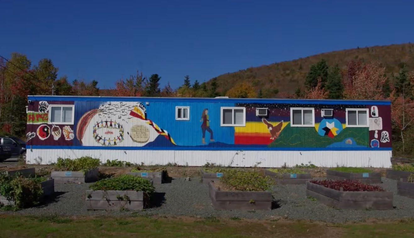 Fresque murale intitulée « KO’QMANAQ », qui représente les résultats du projet de recherche de Spaces & Places (2016). L’œuvre illustre l’importance de la famille, de la culture et de l’apprentissage holistique dans le développement des talents des jeunes.