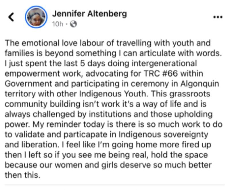 “Au debut, je ne connaissais rien sur la violence sexiste, rien du tout. Mais maintenant, apres toutes les seances, je sais comment entretenir des relations saines. Je comprends comment la violence coloniale continue d’affliger les Autochtones, surtout les jeunes filles et les femmes. Maintenant, je le vois.” (TRADUCTION LIBRE)