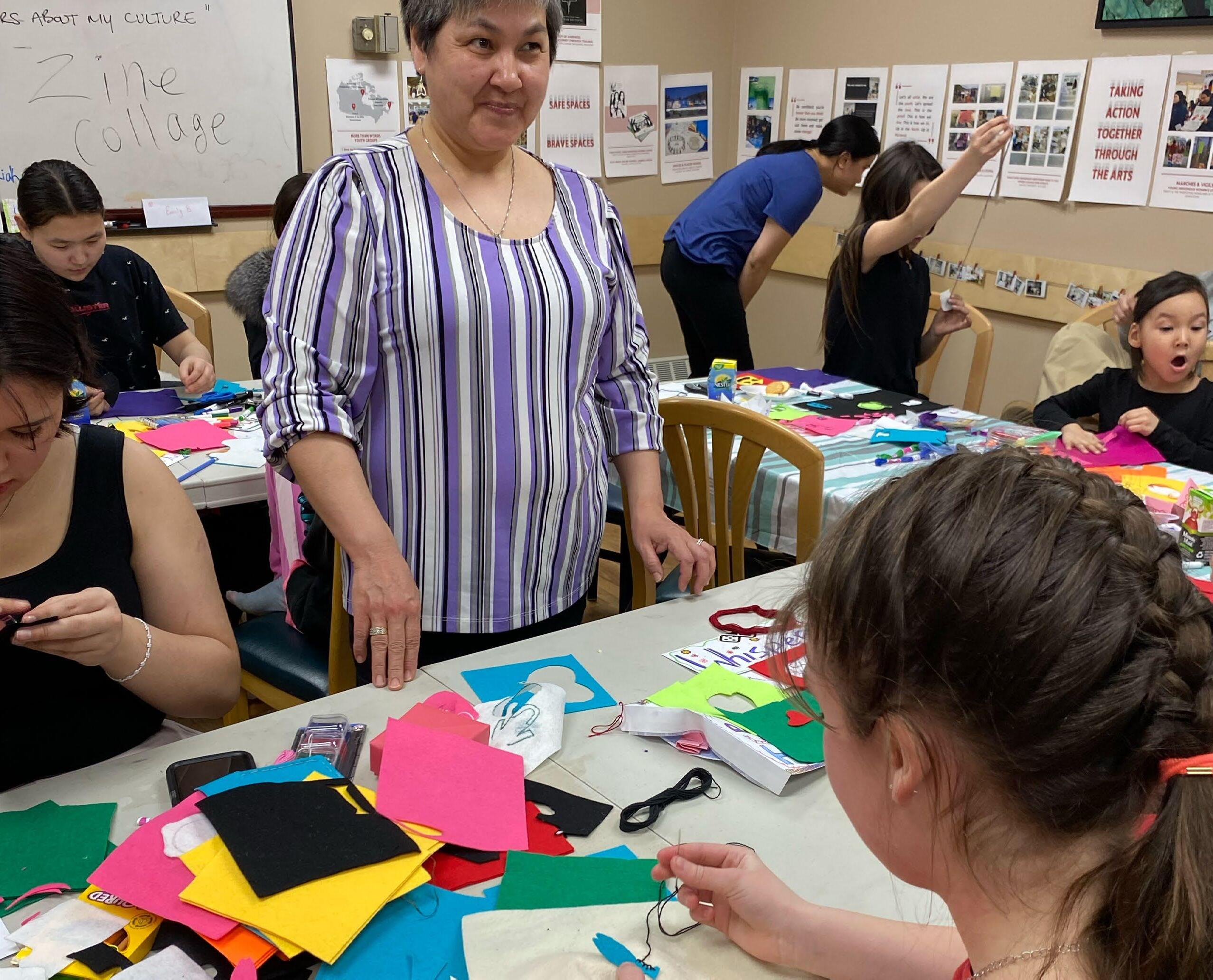 Rankin Inlet ou Kangiqliniq, ᑲᖏᕿᓂᖅ, qui signifie « baie profonde », est une communauté inuit située sur la péninsule de Kudlulik, sur la côte ouest de la baie d’Hudson, au Nunavut. C’est la deuxième communauté la plus peuplée au Nunavut, abritant une population de 3 000 âmes. Le groupe de jeunes Girls Expressing Themselves Through Art (GET Art) est né d’une prise de conscience locale de la nécessité de créer des espaces où les filles et les jeunes femmes inuit de Rankin Inlet pourraient se réunir et s’exprimer en laissant libre cours à leur créativité. Le groupe a choisi la voie des arts traditionnels et visuels – comme la couture, le collage, la création de zines, les vidéoclips et les cellphilms (courtes vidéos sur appareils mobiles) – pour aborder des sujets comme la violence sexiste, l’intimidation et l’insécurité alimentaire. Les liens culturels étant essentiels pour GET Art, des femmes leaders (souvent des aînées et des artistes) de la communauté sont invitées à participer aux activités et à enseigner des traditions inuit, comme le katajjaq (chant guttural), les kakiniit (tatouages traditionnels) et d’autres pratiques culturelles.