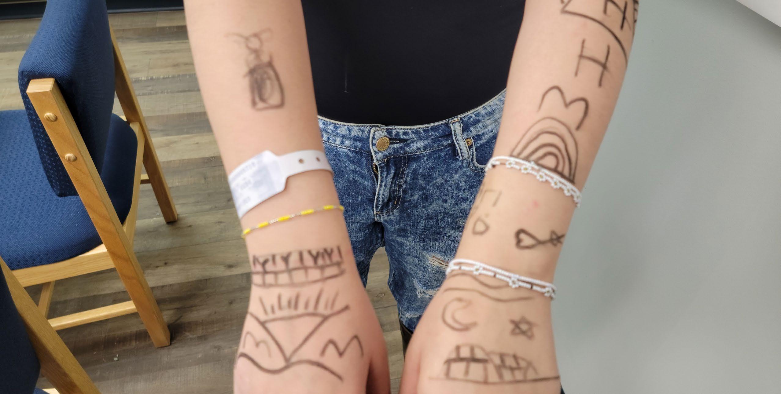 Photo du haut: Les aîné·e·s et les artistes de la communauté participent aux programmes de GET Art comme intervenant·e·s invité·e·s et animateur·trice·s d’ateliers de création. Rosie Ussak, gardienne du savoir, anime un atelier de feutrage dans le cadre d’un programme parascolaire de GET Art (2024). Photo du bas: Pendant l’atelier « Marques d’appartenance » de GET Art, les jeunes apprennent des techniques de tatouage traditionnelles inuit (kakiniit). Les filles s’exercent à faire des tatouages temporaires et lavables inspirés de symboles contemporains et traditionnels (2021).