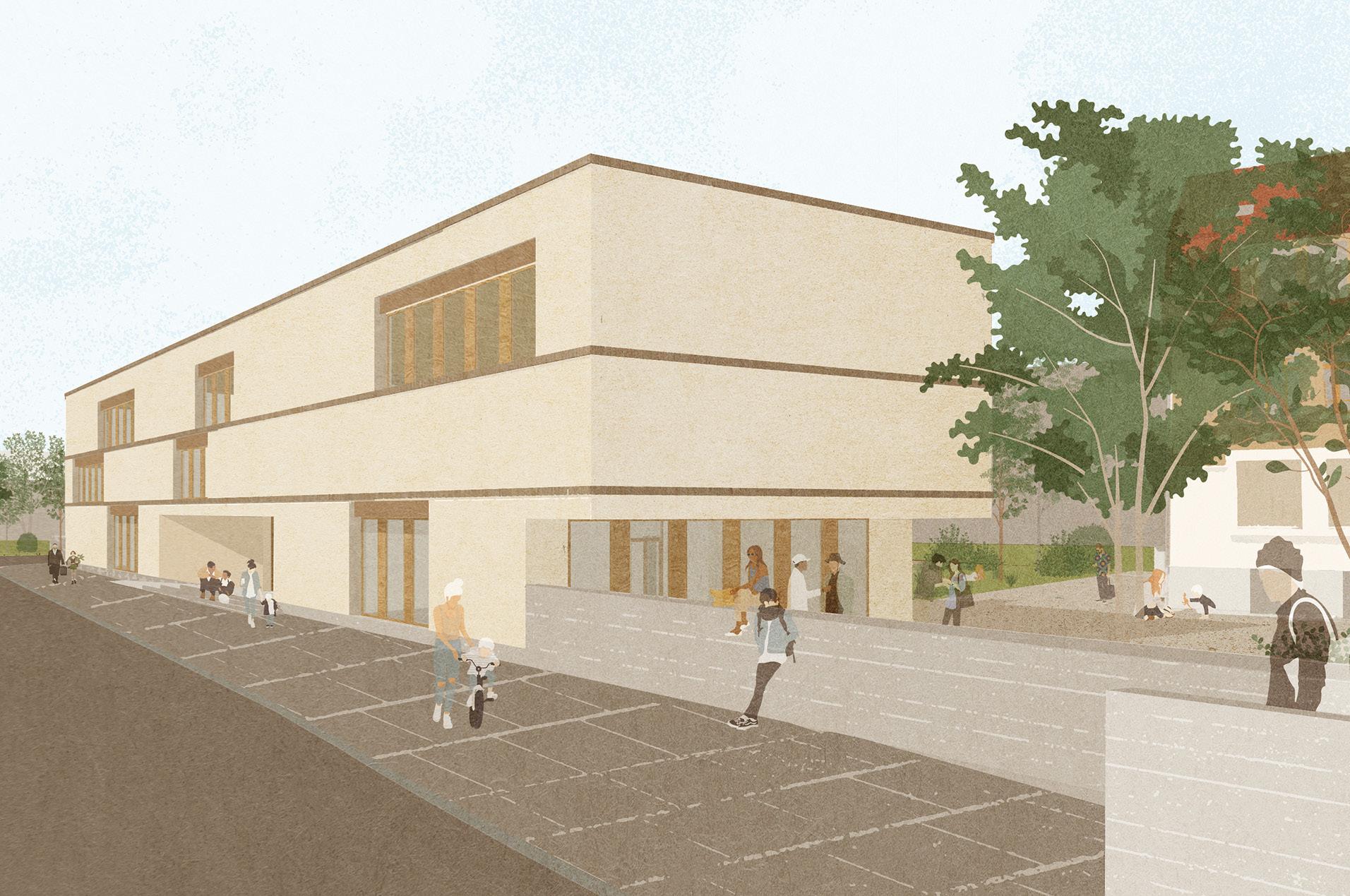 Les trois unités résidentielles sont disposées autour d’une place centrale, servant de point focal à l’ensemble du projet et définissant les trajets et les espaces de détente des résidents. Cette disposition facilite l’accès aux logements de plain-pied et aux ateliers.