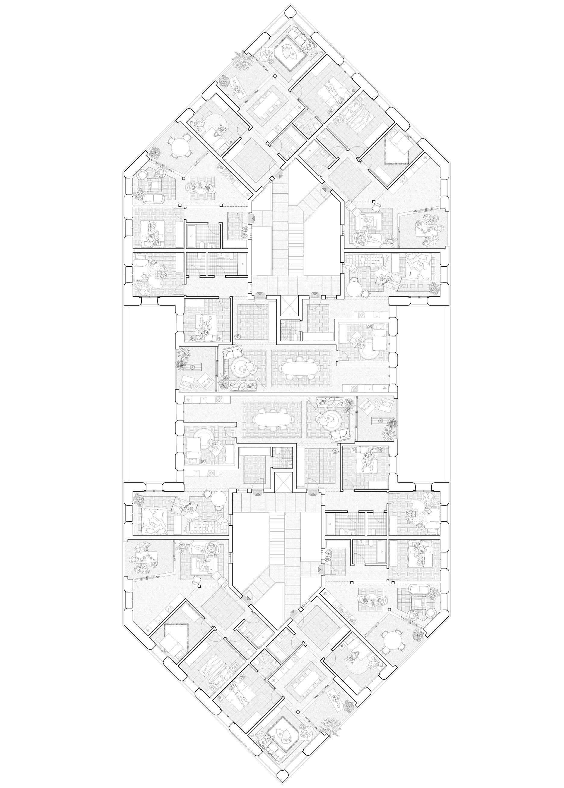 Diagonale, est un projet d’étude exploré au 4ème semestre, réinvente la configuration urbaine des îlots par l’organisation de plots dans un site en expansion. Chaque bâtiment suit une diagonale, favorisant la mobilité douce et reliant le parc des Acacias à la Drize, un ruisseau renaturé.