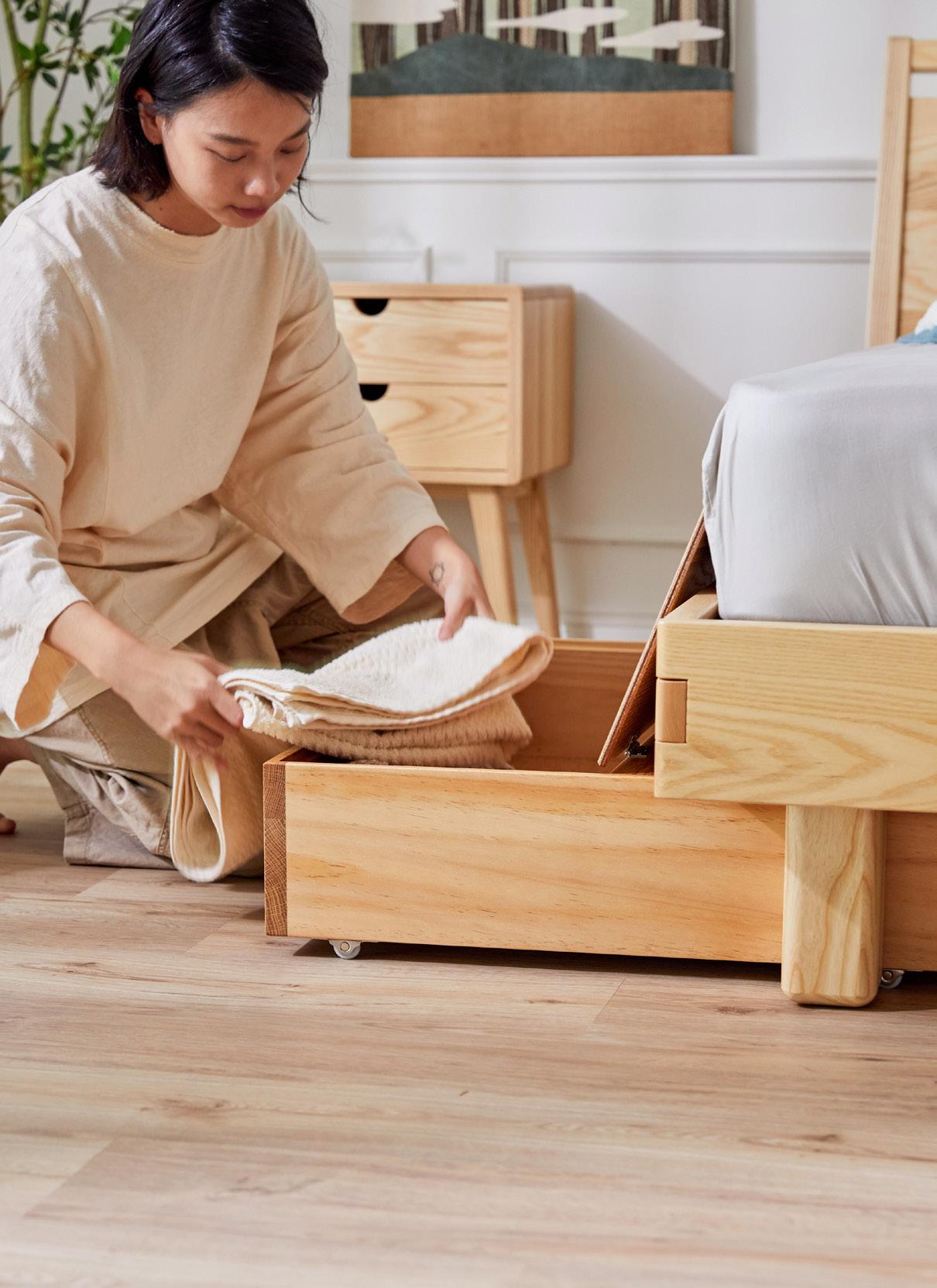 床底抽盒 ASH 北美梣木 / OAK 北美白橡木 + 松木+樺木夾板貼皮 W 75 寬 75 x 深 62 x 高 18 cm W 93 寬 93 x 深 62 x 高 18 cm 白橡款梣木款 MO-EB1-75-ASH $5,800 MO-EB1-93-ASH $6,800 MO-EB1-75-OAK $6,500 MO-EB1-93-OAK $7,500 Tips ! 其他床款也可以客製床 底加高,再加購床底抽盒哦! 客 製 需求歡迎另洽門市。 抽盒均附輪子及蓋子 床架 Tips ! 選購一大一小剛剛 好,選購兩小可以恰巧避 開床頭櫃位置:) 58