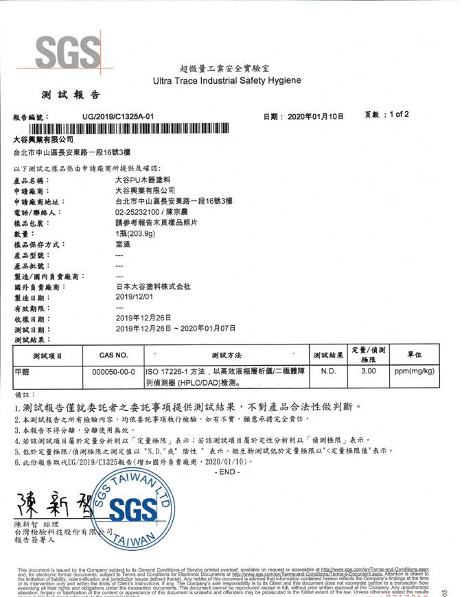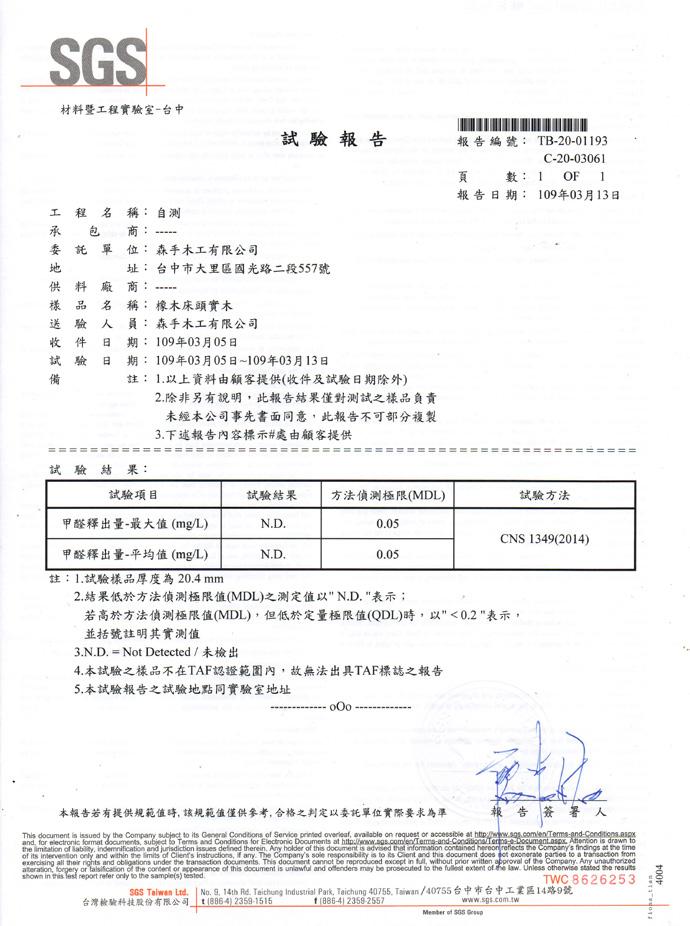 指接實木床頭板通過 CNS1349(2014) 甲醛釋出量無檢出 VATON 大谷塗料 ISO 17226-1 甲醛無檢出 KOYO JATA001806 F ☆☆☆☆製品證明 4