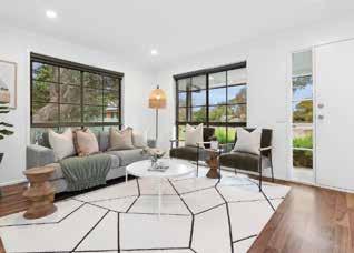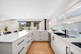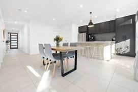 Embodying the essence of modern coastal living with heightened ceilings and engineered timber floors, plantation shutters, VJ panelling and a soothing whiteon-white colour palette, the first-floor layout encourages family connection across a cosy lounge, family room, dining space and custom culinary zone, where easy hosting is the result of premium appliances and a