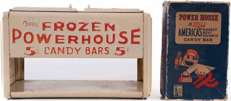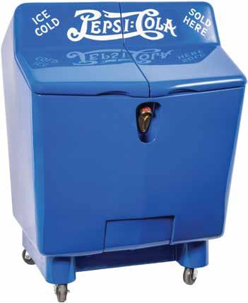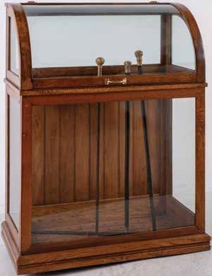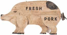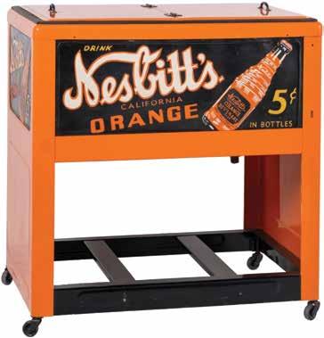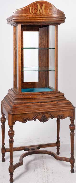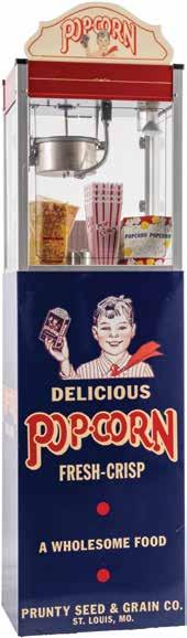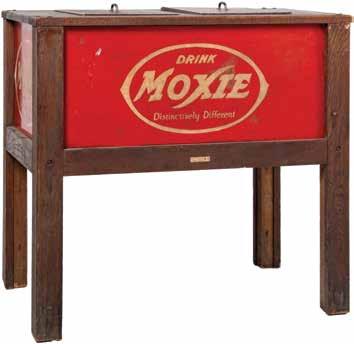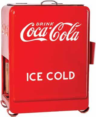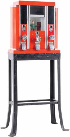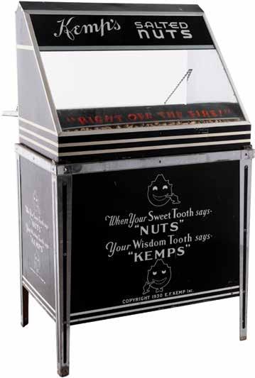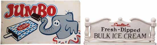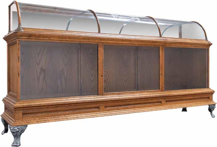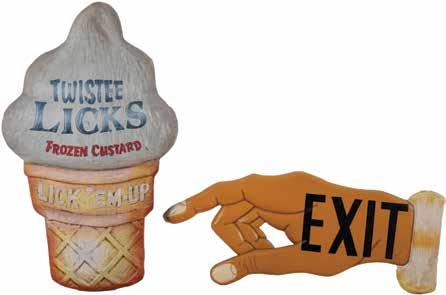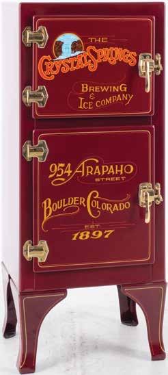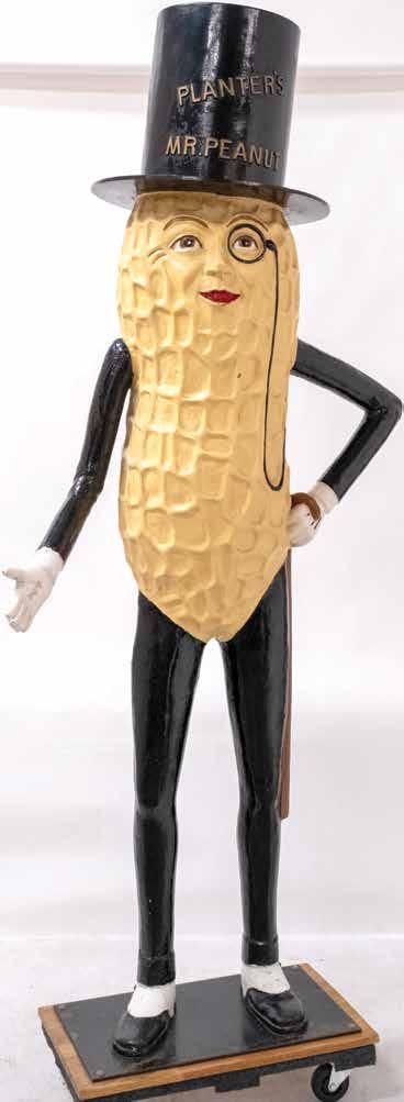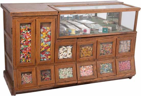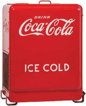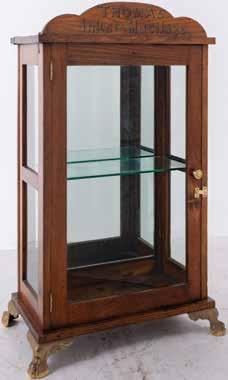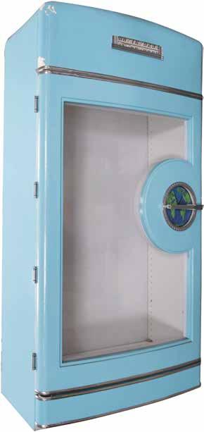 54” x 31” x 106” A figural display cabinet or display feature in the form of an oversized 40s refrigerator. Wood construction with metal detail styling, internal shelving, and front load design. CONDITION: Showing light wear from transporting and handling. Has interior shelving, working front door, no breaks or repairs. This is not a standard shippable item and will require 3rd party shipping or pickup arrangements to be made. (Very Good). 1,500 - 3,000
