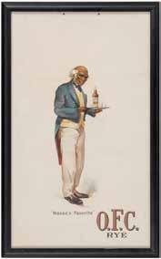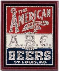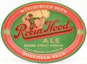 11” x 8”. C. 1930s. A.B. Co. Brewers, Scranton, Pennsylvania. Difficultto-find small oval tray. Beautiful bright red and green colors throughout and beautiful detail on Robin Hood. Manufactured by Electro-Chemical Engraving Co. Inc., marked on bottom edge. CONDITION: Face is extremely clean, with some minor scratching to rim, one above the “U” in “Wurzburger”, and a scuff to the right of “Beer” on red rim. (9.25).
