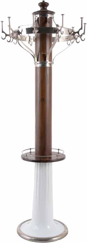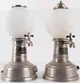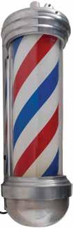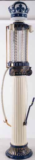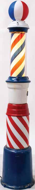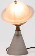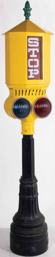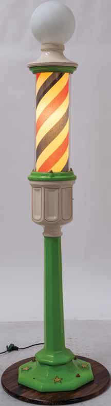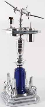 7” X 7” X 25 -1/2” CONDITION: It shows original paint to the base and column, original knobs on the front, ceramic shade, and correct switches with a replaced electrical cord. Not marked for the maker. The paint to the base shows some areas of scrapes and paint loss. There are some areas of oxidation to the paint, but overall with a great Art Deco image. (Good - Very Good). 500 - 1,000