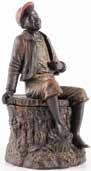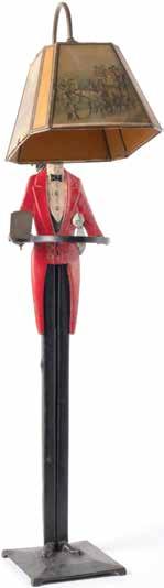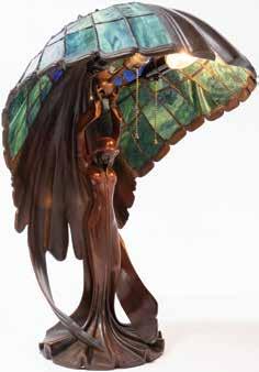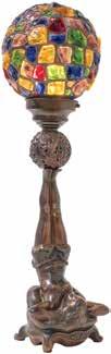 7” X 7” X 25” CONDITION: A very interesting figural lamp of a young lady positioned upside down holding a decorative ball, with jeweled bronze lamp shade. Wonderful patina, no breaks or repairs, and operational. (Excellent). 700 - 1,500