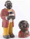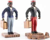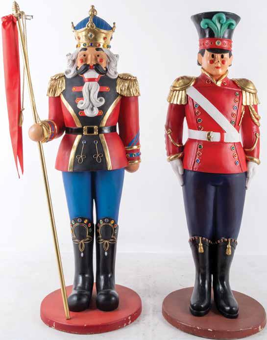 Largest: 25” x 23 - 1/2” x 71”. C. 1950. CONDITION: Two life-like full-sized nutcracker holiday figures. (A) A soldier in uniform, showing good paint and color. There is some chipping around the base due to handling. No chips, cracks or repairs. (B) A crowned soldier carrying a scepter, showing good color. No chips, cracks or repairs. No distinguishing flaws. This is not a standard shippable item and will require 3rd party shipping or pickup arrangements to be made. (Very Good - Excellent). 500 - 1,500