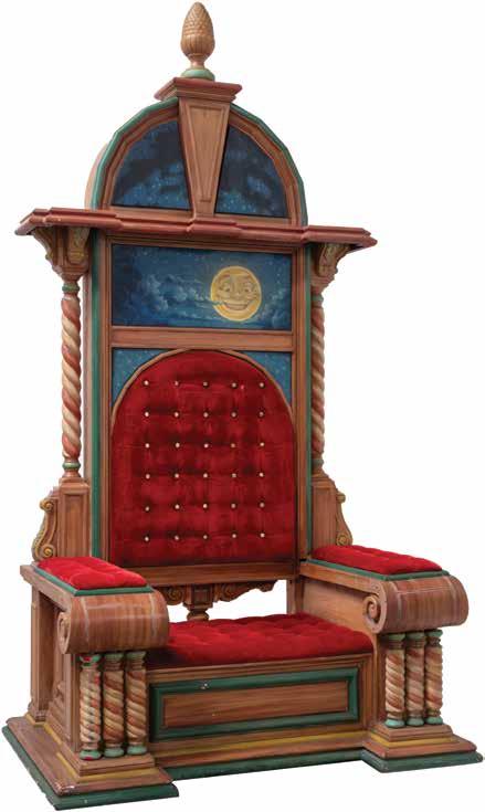 64” x 39” x 120”. C. 1970. CONDITION: Large and exaggerated throne used as a movie or show prop. Wood construction with felt tufted upholstery, moon graphic, and top gallery trim. Showing very little wear from use, no soiling, and solid construction. This is not a standard shippable item and will require 3rd party shipping or pickup arrangements to be made. (Very Good). 800 - 2,000