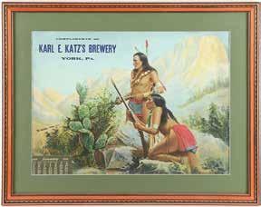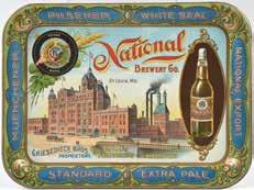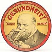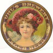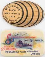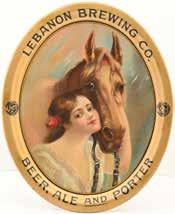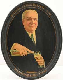 12” Dia. Pre-Prohibition, c. early 1900s-1910s. Columbia Brewing Co., Shenandoah, Pennsylvania. Difficult-to-find stock scene tray from the Columbia Brewing Co. Manufactured by H.D. Beach Co., marked on bottom edge. CONDITION: Has some general overall wear and scratching, some fade and loss of the lettering. Appears to be some manufacturing paint overlay on outer rim, a mix between black, burgundy and green on lower rim. (6.25). 300 - 600